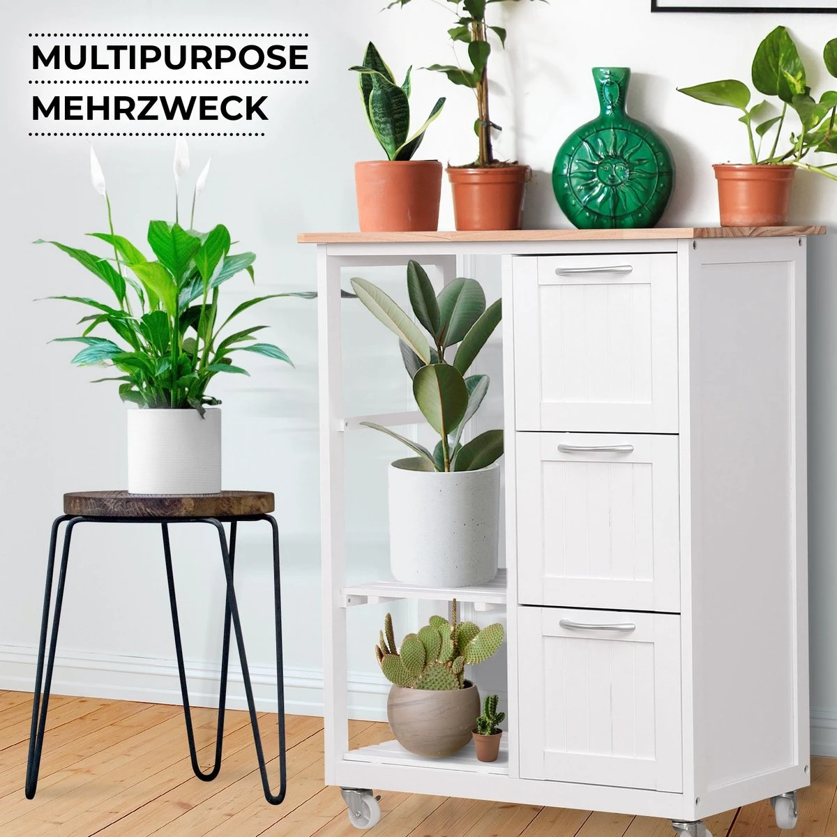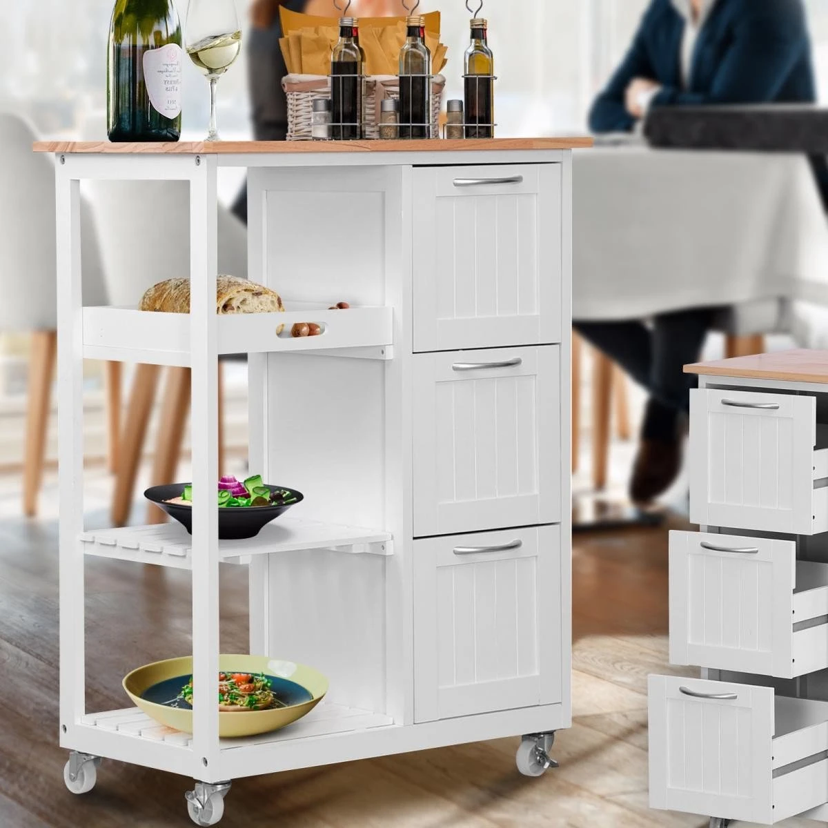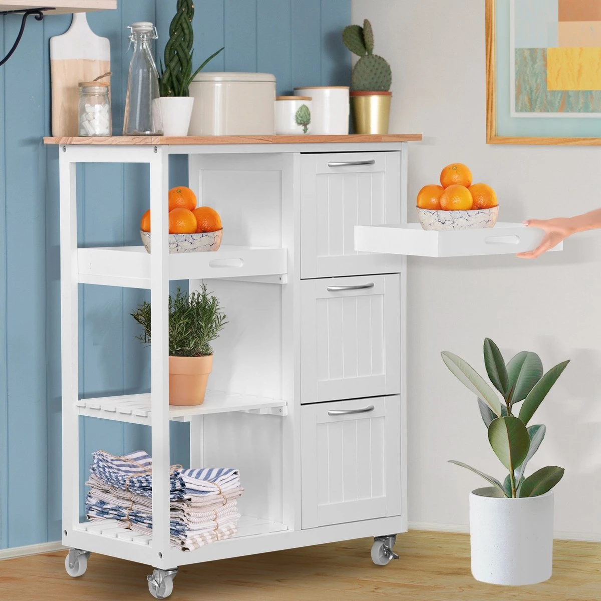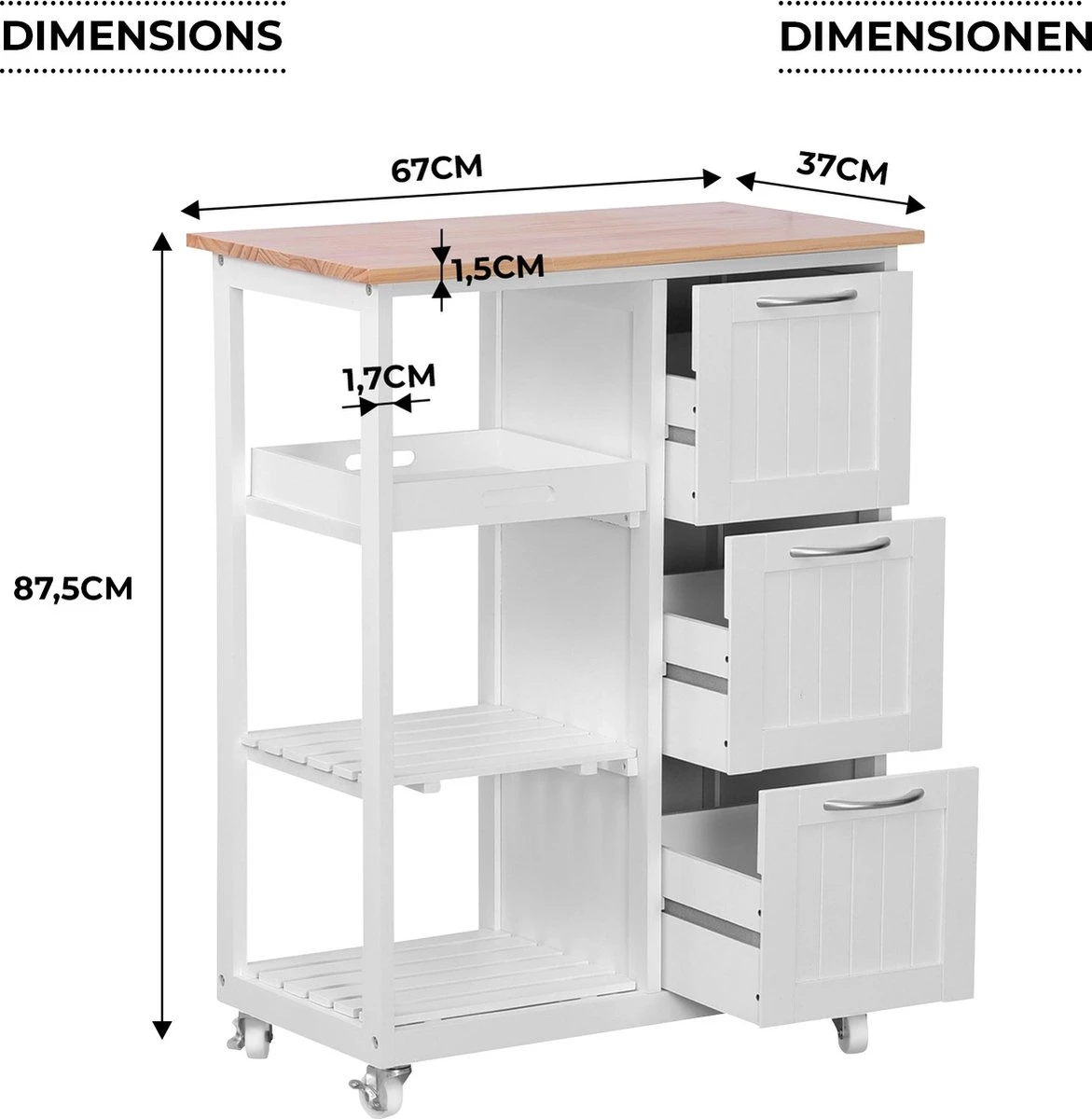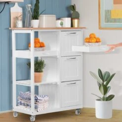 Keuken trolley op wieltjes – 3 lades en 3 plankjes – Wit Altijd al een keukentrolley in de keuken willen hebben? Dan hebben wij nu een superleuke aanbieding voor jou! De keukentrolley is gemaakt van hoogwaardig materiaal en handig in gebruik. Door zijn compacte formaat en moderne uitstraling past hij in iedere keuken. Door de zwenkwielen is deze trolley praktisch in gebruik. Zet hem op een vaste plek in de keuken of rol hem door jouw appartement of woonkamer. De trolley is onder andere geschikt om jouw (kook)boeken of keukenaccessoires goed te organiseren en bij de hand te hebben. Gebruik de trolley in de keuken of zomers bij het bbq’en. Uiteraard dient hij ’s avonds wel weer binnen te worden gezet. Deze keukentrolley beschikt over diverse planken en lades en heeft hierdoor een ruime opslagcapaciteit. * Keuken trolley op wieltjes, 3 lades en 3 plankjes, in wit, country house stijl. * Een van de niveaus dient ook als een verwijderbare serveer tray. * Afmetingen: 67 x 37 x