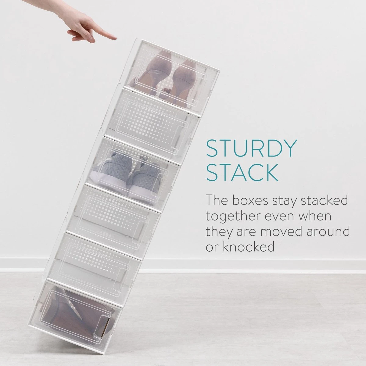 - MAXIMALE RUIMTE: De set van 6 stapelbare schoenendozen is perfect voor het eenvoudig opbergen van je schoenencollectie. Elke doos is doorzichtig zodat je makkelijk kunt zien welke schoenen in welke doos zitten.