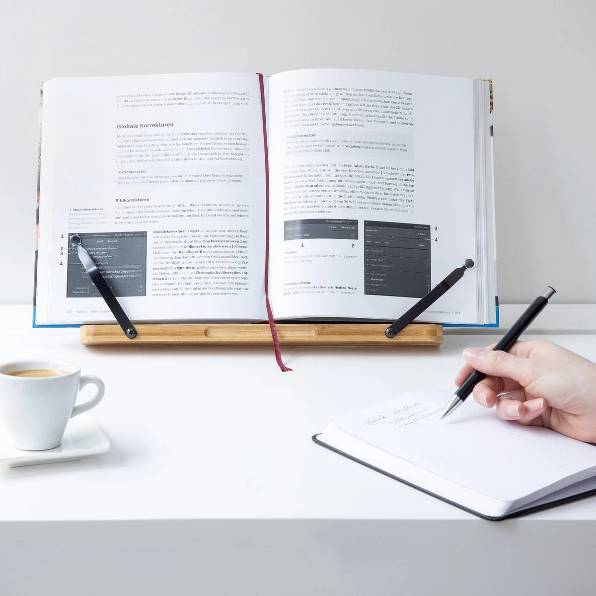 - Dankzij het grote oppervlak om boeken op te plaatsen is hij niet alleen geschikt voor kookboeken of leesboeken, maar ook voor bijvoorbeeld kunstgallerijboeken om afwisselende schilderijen in huis te vertonen. De klemmen houden de pagina’s tegen.
