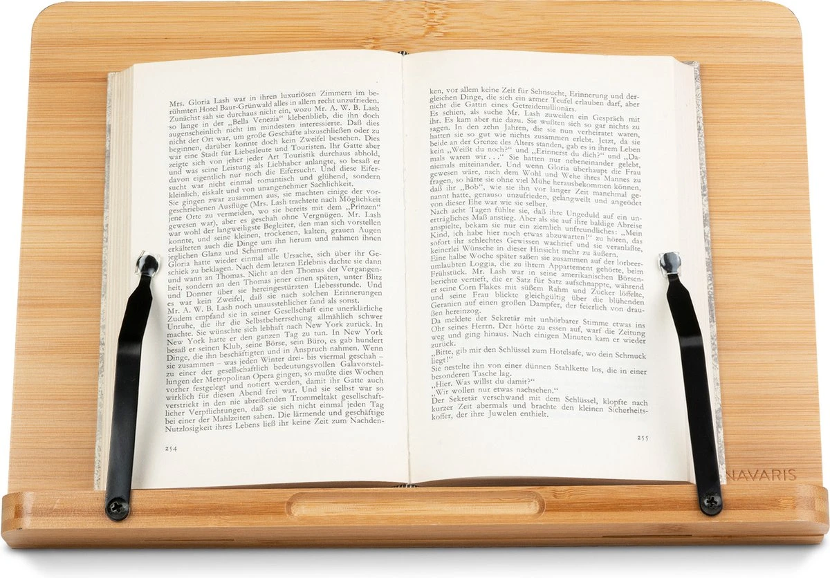 Deze multifunctionele standaard van Navaris is meer dan alleen een boekenstandaard, omdat er met gemak ook tablets en e-readers op gezet kunnen worden. De metalen klemmen houden pagina’s op de plek. VERSTELBAAR VOOR GROTER GEMAK