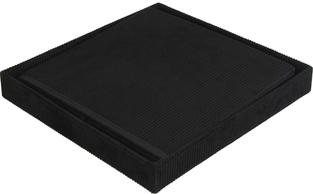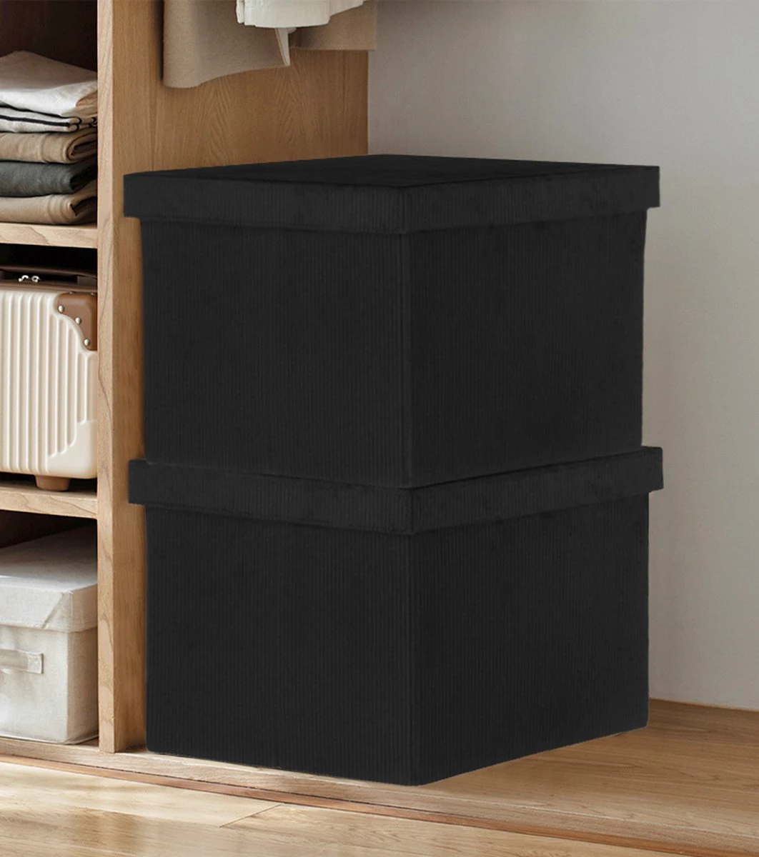 Een prachtige corduroy stof in de kleur zwart zorgt voor een mooie en luxe uitstraling van de opbergers. De basis van de manden is gemaakt van drielaags vlies karton en daarom erg stevig. Je kunt de manden ook opvouwen als je ze even niet wil gebruiken.