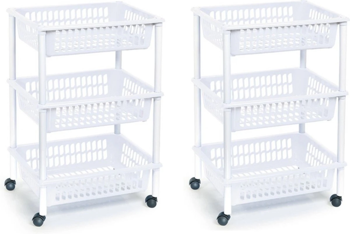 Opberg trolley/roltafel/organizer met 3 manden 40 x 30 x 61,5 cm wit/wit. Handige roltafel/opberg trolley met 3 manden om diverse spullen in op te bergen, zoals tijdschriften/kranten, groenten, speelgoed, opladers/kabels en andere losse spulletjes. Materiaal: kunststof.