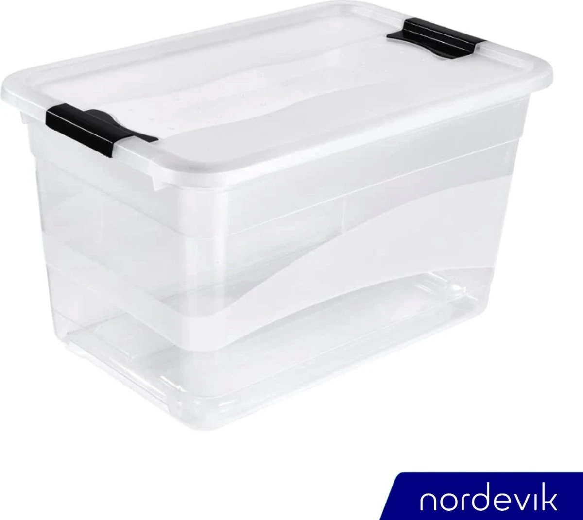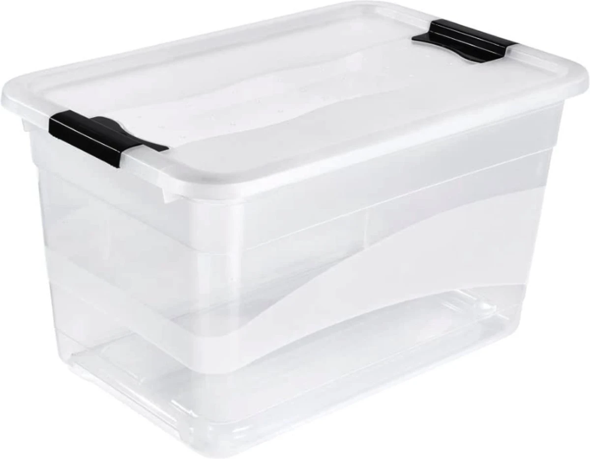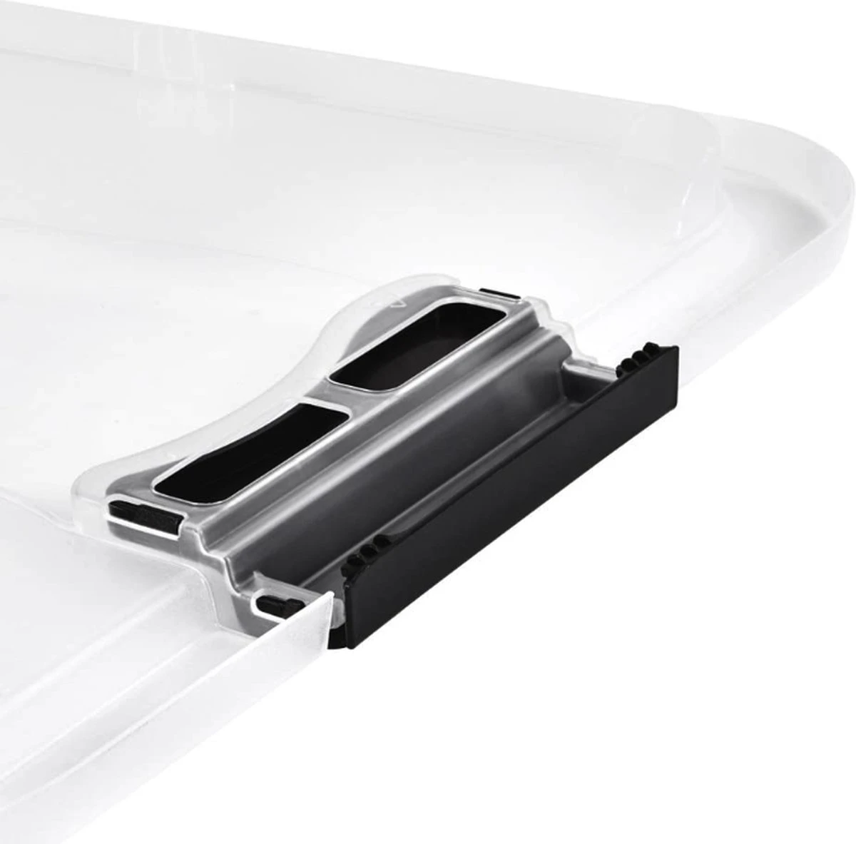 De zwarte sluitclips zorgen ervoor dat de deksels van de kunststof boxen goed gesloten kunnen worden.
