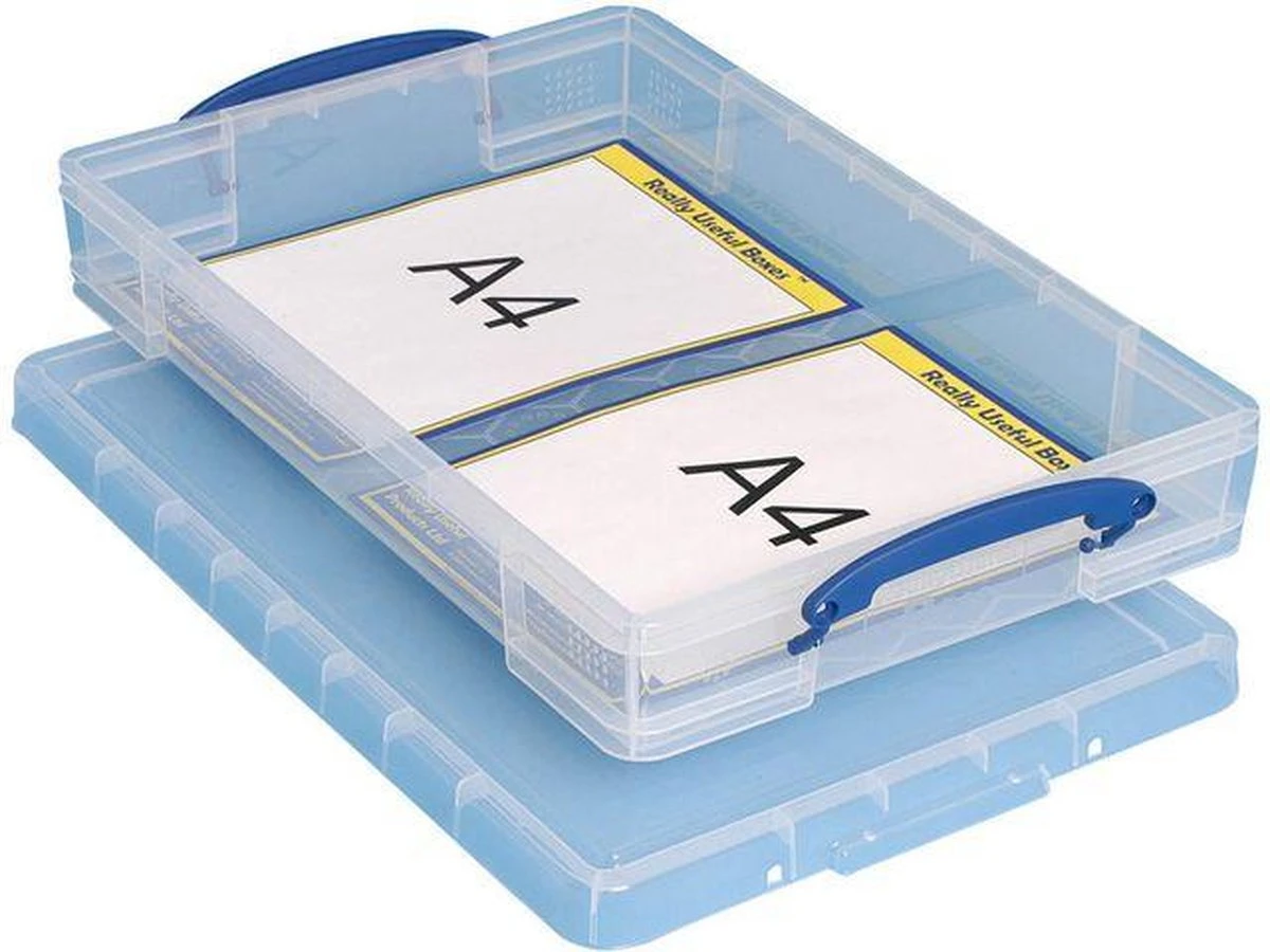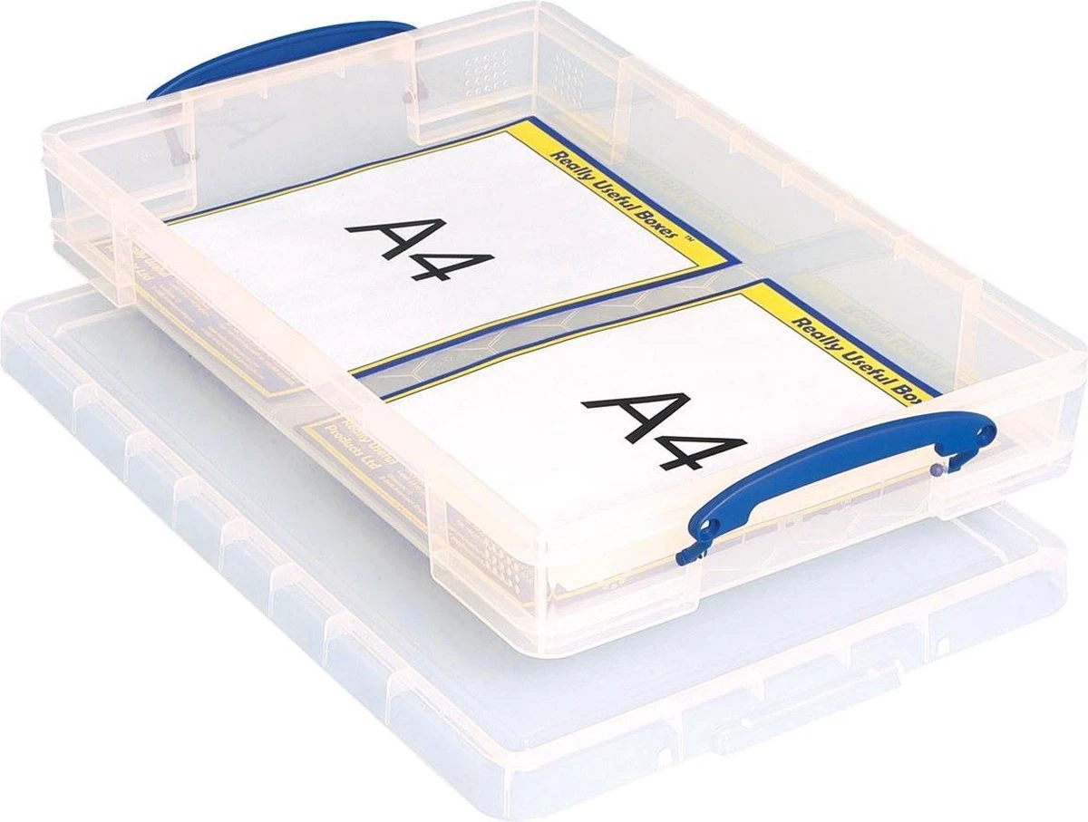 * Handige opbergbox gemaakt van 100% Polypropyleen. *Duurzaam, stapelbaar en transparant. *Afsluitbaar door blauwe vergendelings handvaten. *Ideaal voor het opbergen van A3 papier, speelgoed, tuingereedschap. *Afmetingen: buitenmaat 520 x 340 x 85mm, binnenmaat 460 x 298 x 70(lengte x breedte x diepte).
