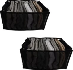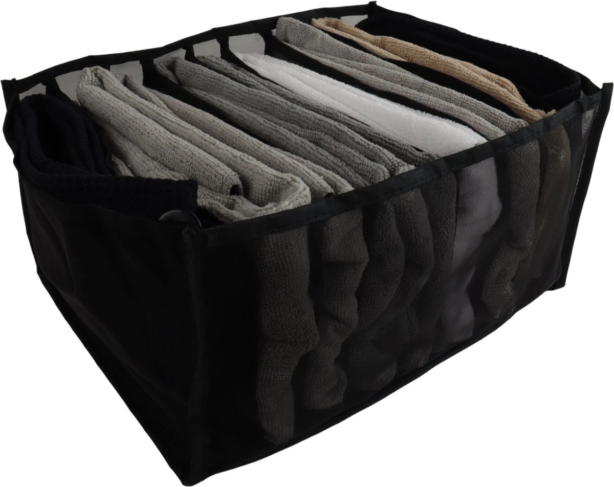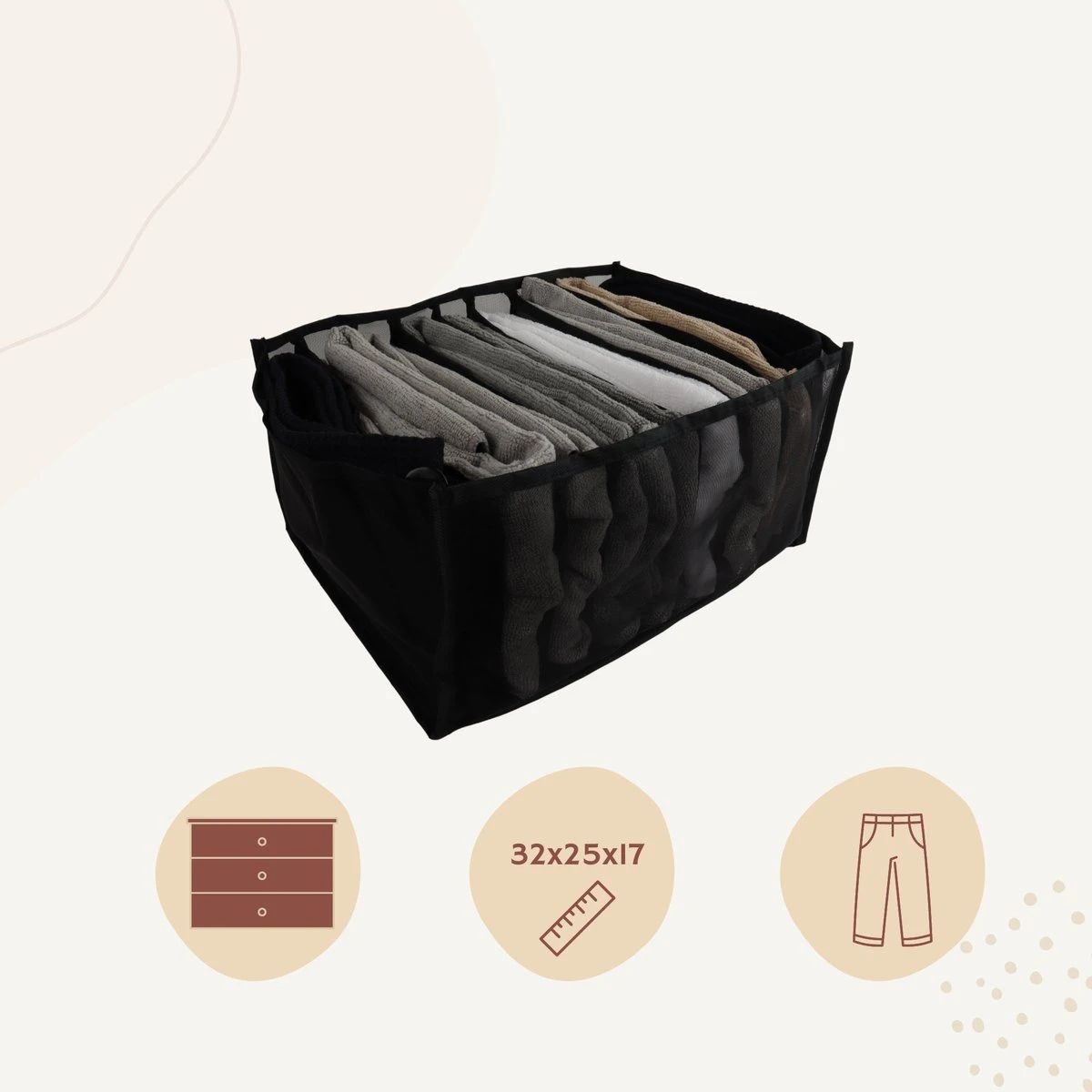 De Orange85 Kledingkast Organizer is een handige organizer voor het organiseren van uw broeken. Het heeft 9 vakken en wordt geleverd in een set van 2 stuks. De organizer is gemaakt van kunststof en heeft een zwarte kleur. De afmetingen van de organizer zijn 32 x 17 x 25 cm.