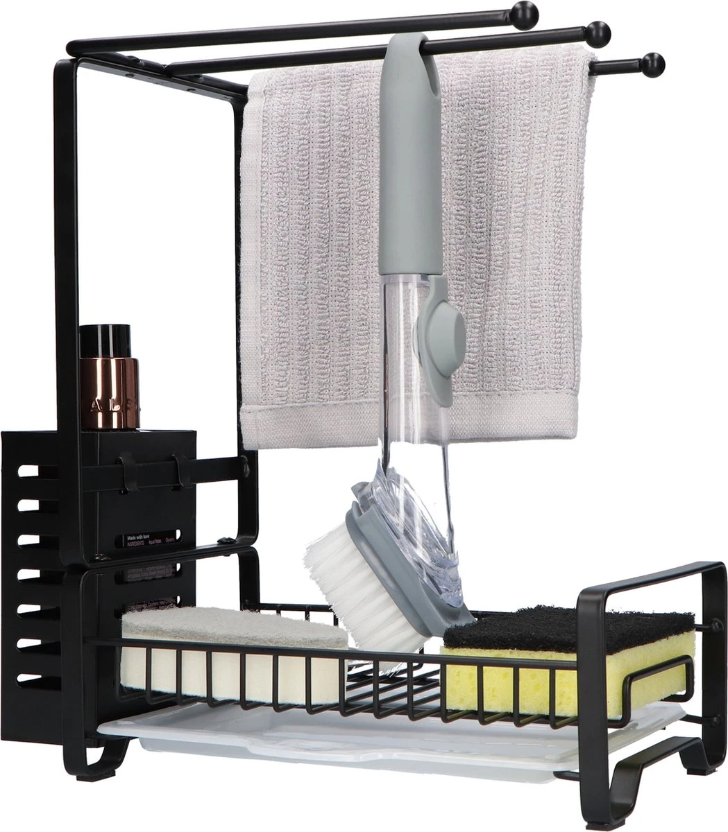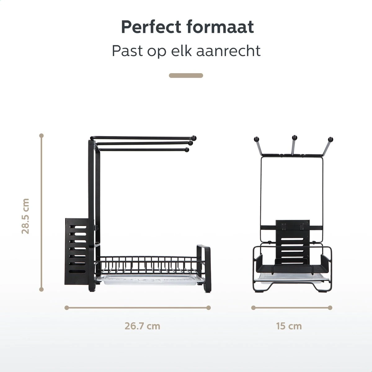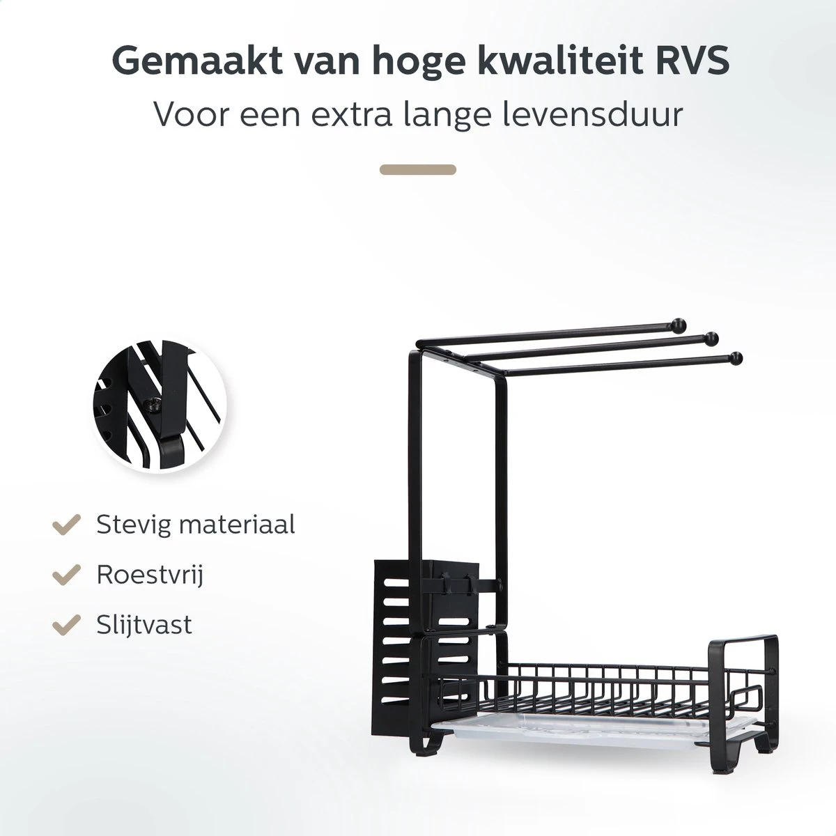 De aanrecht organiser is gemaakt van hoogwaardig roestvrij staal (RVS), afgewerkt met een zwarte coating om een strakke en moderne uistraling te creëren. Onder alle pootjes zijn anti-slip materialen bevestigd.