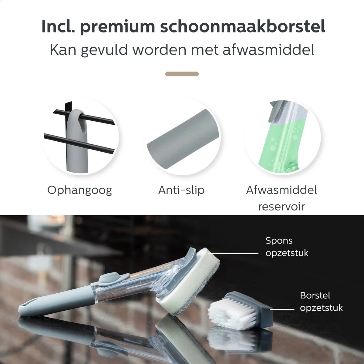 Bij aankoop van een aanrecht organiser wordt de multifunctionele afwasborstel er gratis bij geleverd. Deze afwasborstel wordt geleverd met een borstel en spons opzetstuk. De afwasborstel is voorzien van anti-slip materiaal en een afwasmiddel resevoir, waardoor geleidelijk afwasmiddel gebruikt kan worden door te drukken op de knop. De borstel kan gemakkelijk worden opgehangen aan de organiser of geplaatst in het afneembare bakje.