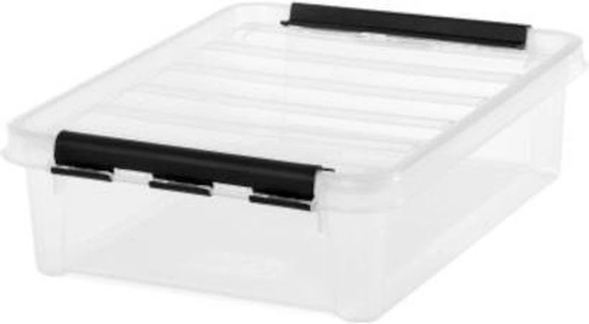 Deze universeel inzetbare opbergbakken met deksel zijn gemaakt van stevig transparant kunststof. De structuur in de deksel zorgt ervoor dat de bakken goed op hun plaats blijven als ze worden opgestapeld. Ze blijven ook goed vastzitten door de stevige zwarte kleppen. Er zijn 8 verschillende varianten beschikbaar. De specificaties van deze boxen zijn: