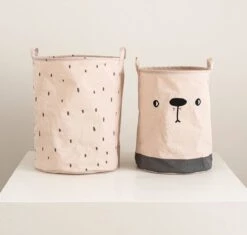 In deze vrolijke set speelgoedzakken met stippen- en berenprint kan al het speelgoed netjes worden opgeborgen. Met een opbergzak krijgt een kinderkamer ook meteen een gezellige uitstraling. Je krijgt een grote en een kleine speelgoedzak. En ze staan ook ook leuk in de woonkamer.