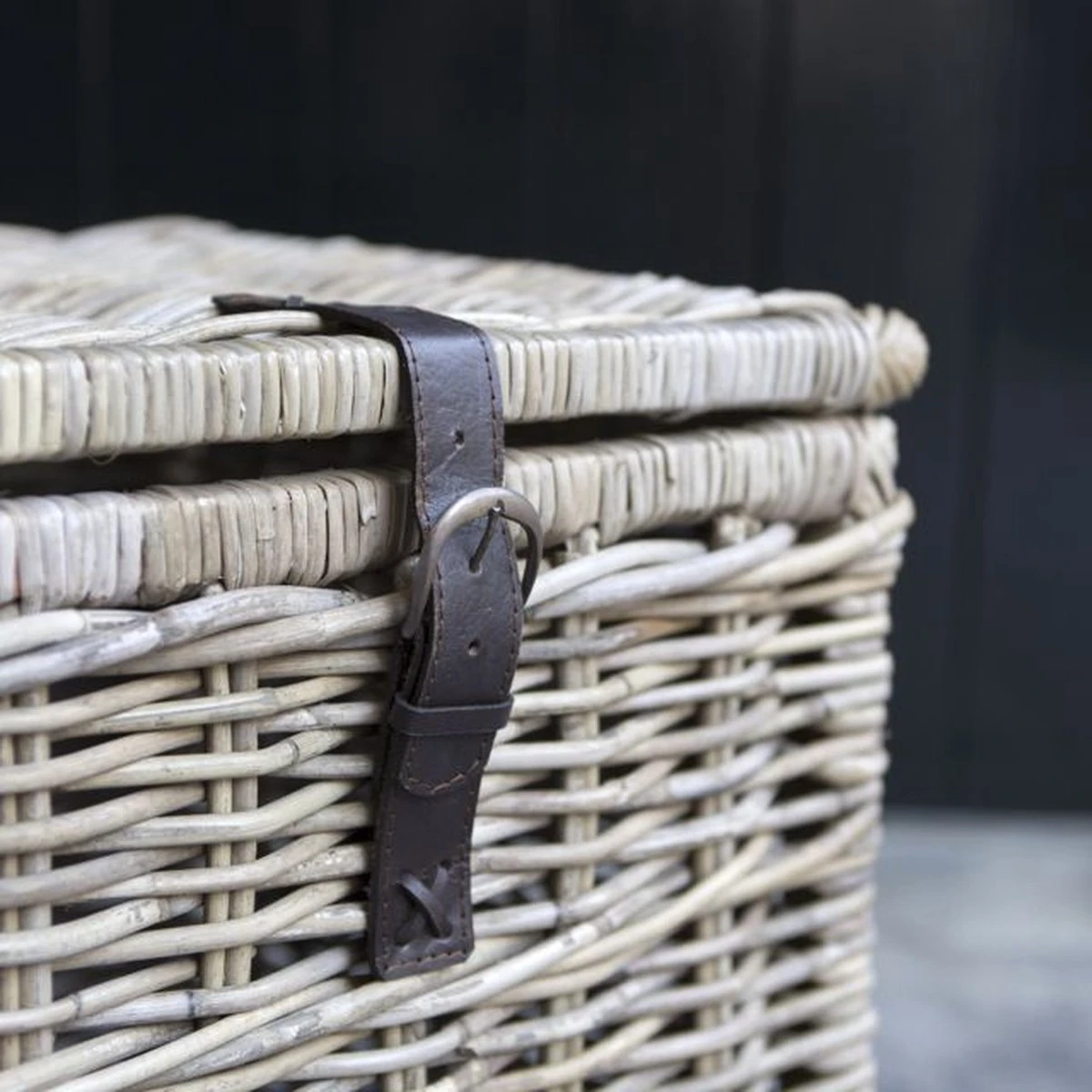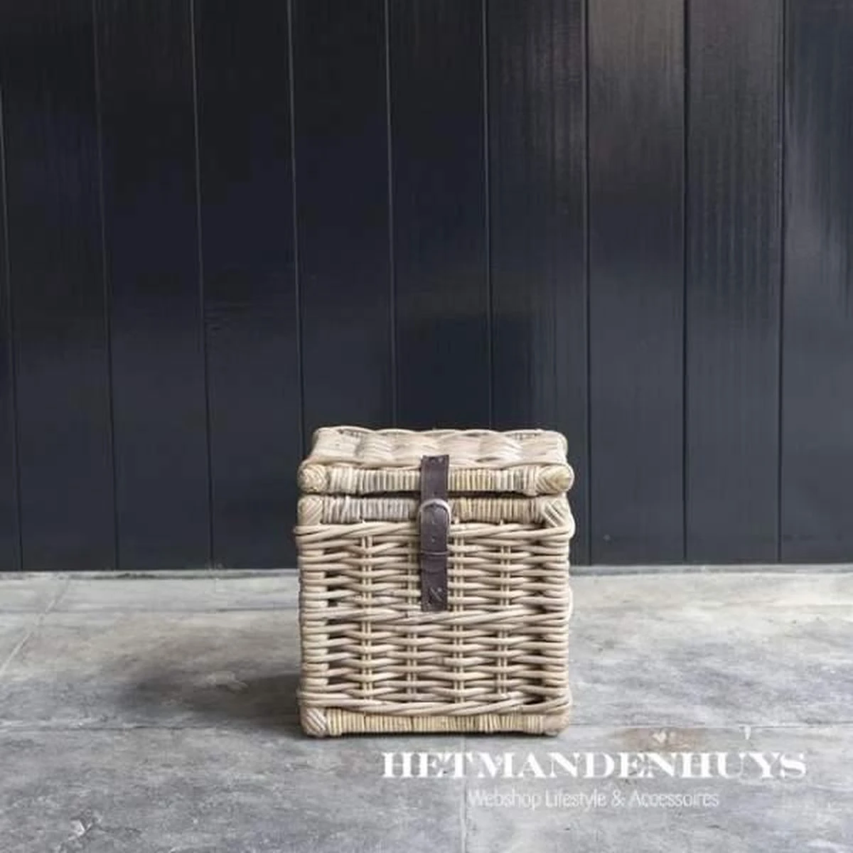 Stevige, rotan mand met deksel. Deze mand is voorzien van een leren riempje waarmee de mand kan worden afgesloten.