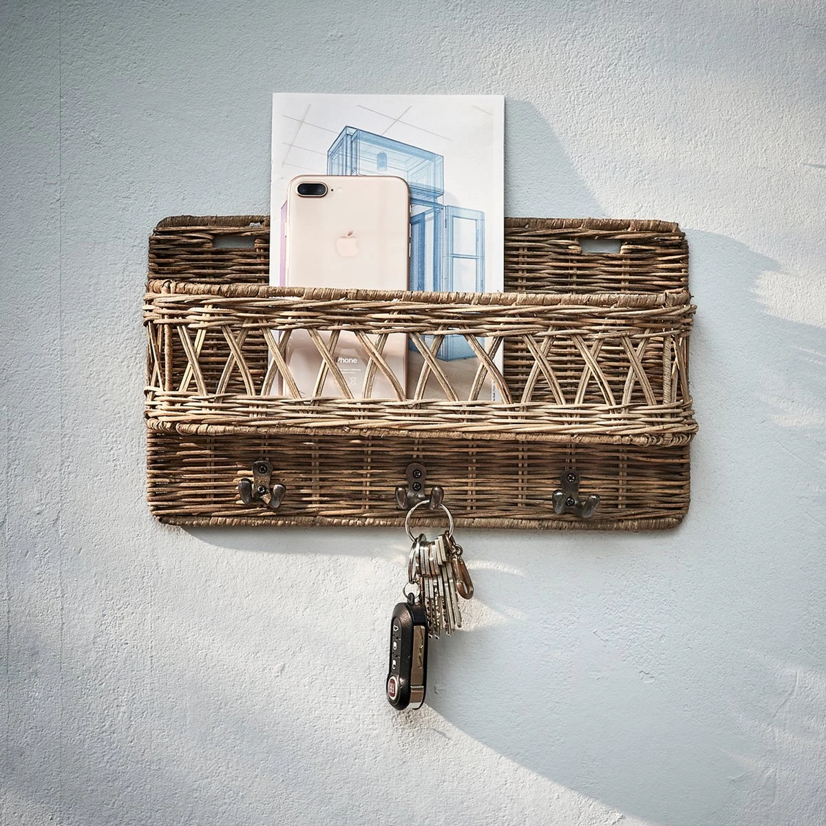 Geen gezoek meer in huis naar de sleutels. Gewoon op hun vaste plek in het sleutelmandje van rustic rattan. Of aan het sleutelrekje, allebei de benamingen kloppen. Want behalve haken, heeft deze sleutelhouder daarachter ook een mandje waar sleutels, of deurpasjes of zoiets dergelijks in kunnen liggen. Met zijn breedte van 35 cm vindt de sleutelhouder altijd wel een plekje in de buurt van de deur.