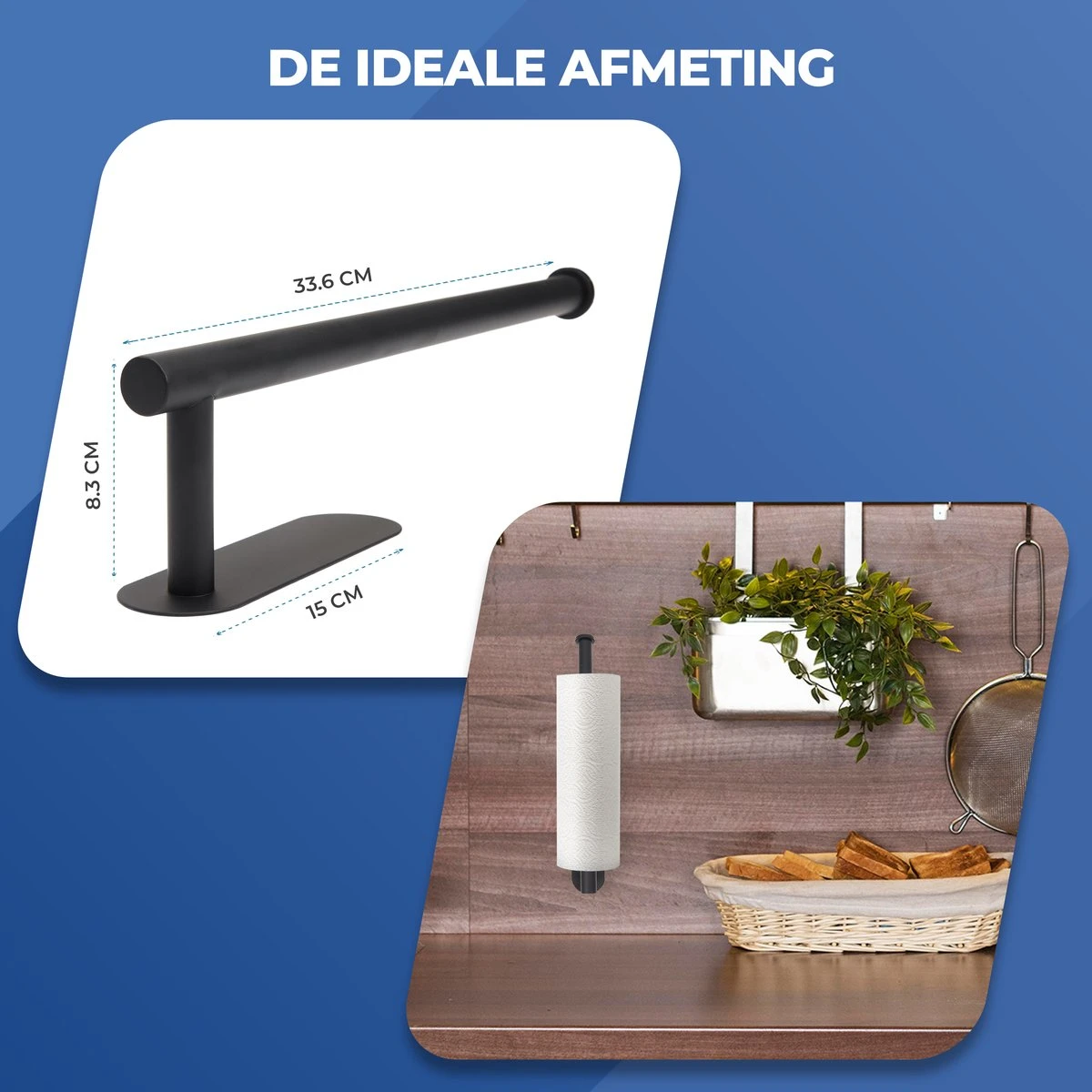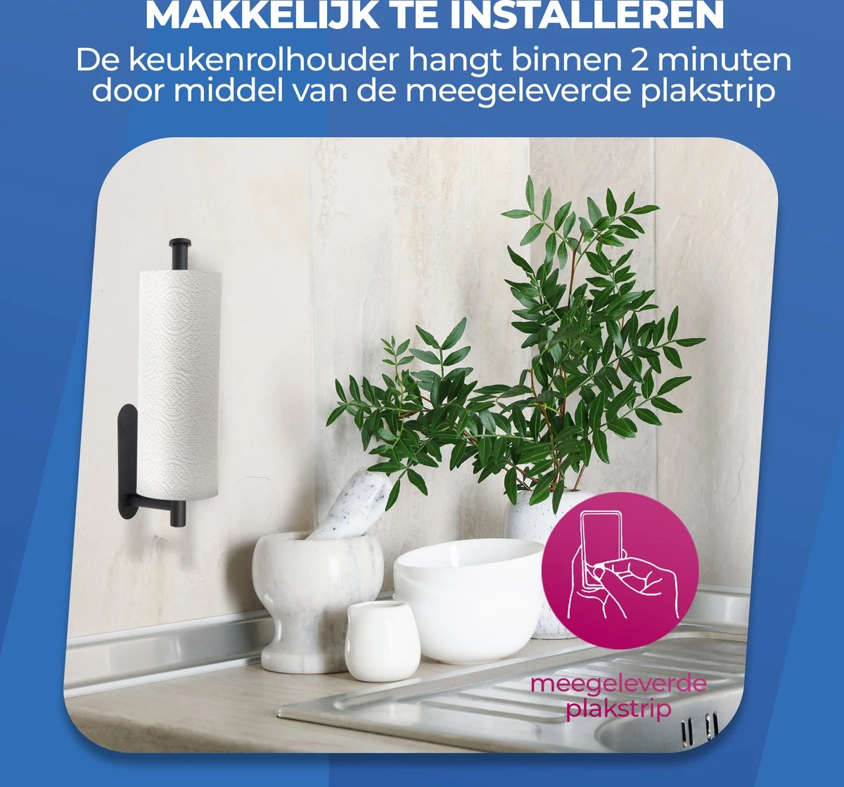 Deze Keukenrolhouder past bij verschilende stijlen en komt in elke keuken wel van pas. Je kan de Keukenrolhouder gemakkelijk ophangen zonder te hoeven boren. Hierdoor kan je de Keukenrolhouder overal ophangen waar je maar wilt. Dicht bij de kookplaat om even snel wat vet te verwijderen of bij de wasbak om je handen even snel mee af te drogen.