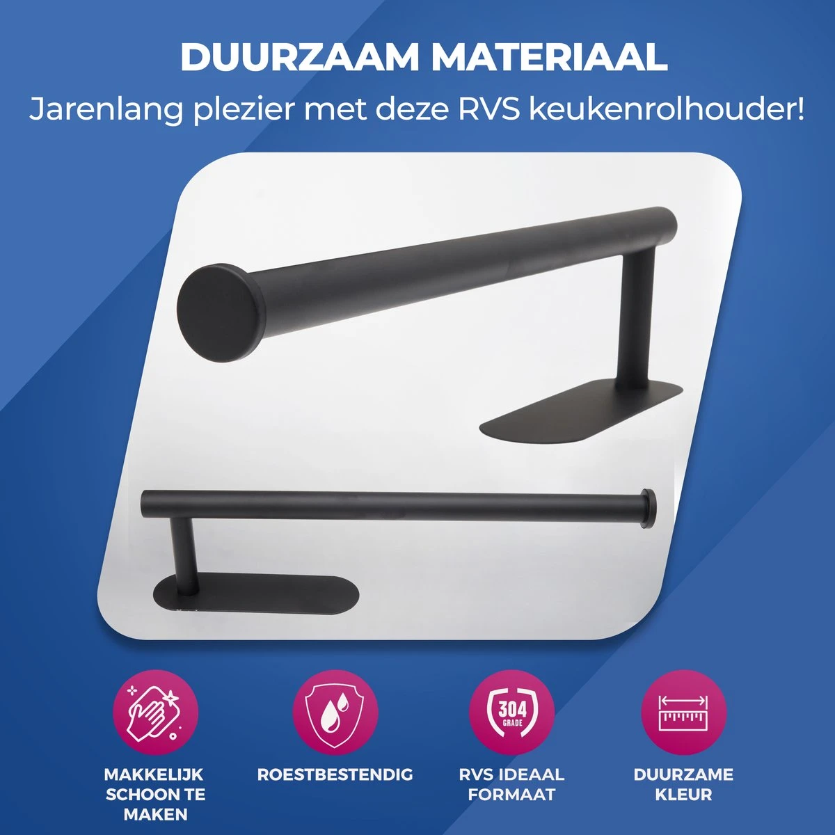 Stijlvol en RVS – De Keukenrolhouder ziet er erg goed uit en heeft een moderne noch wat klassieke stijl. Waardoor het in veel keukens past. De Keukenrolhouder is gemaakt van Roest Vrij Staal (RVS) met een mat zwarte coating. Het is van licht materiaal, zodat het 3M Tape niet onnodige veel gewicht hoeft te dragen.