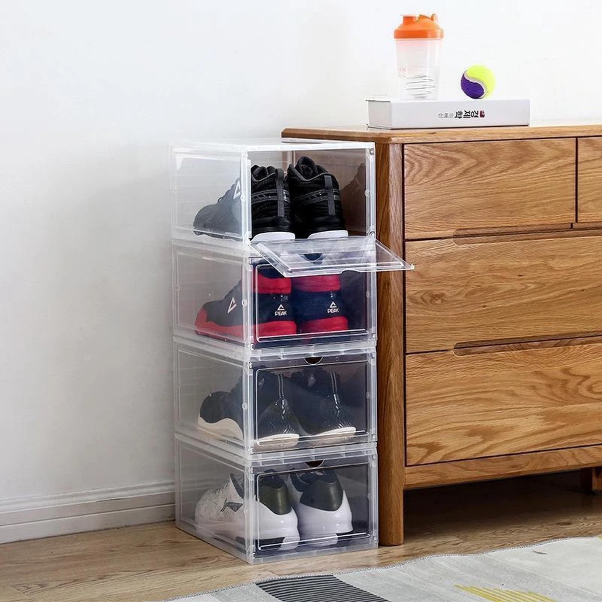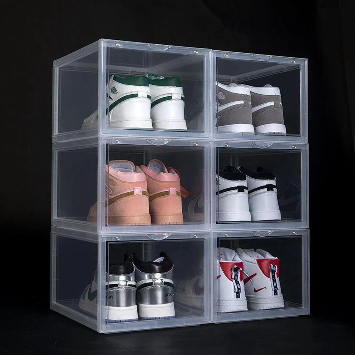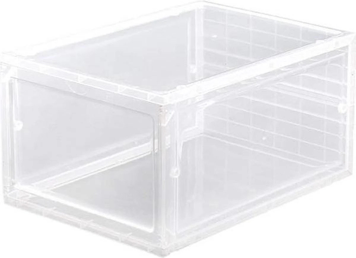Met deze praktische kunststof schoenendozen stel je een compleet schoenenopbergsysteem samen voor al je schoenen. De schoenendozen hebben een royale maat, zodat zelfs stevige en grote schoenen, zoals sneakers en wandelschoenen, gemakkelijk kunnen worden opgeborgen. Ze zijn stapelbaar en volledig afsluitbaar met een handige magneetsluiting. Hierdoor blijft de klep op zijn plaats en blijven de schoenen stofvrij als je ze niet nodig hebt. De voor- en zijkanten van de stevige (schoenen)dozen zijn gemaakt van transparant, stevig kunststof, zodat je het overzicht behoudt en snel de schoenen vindt die je wilt dragen.