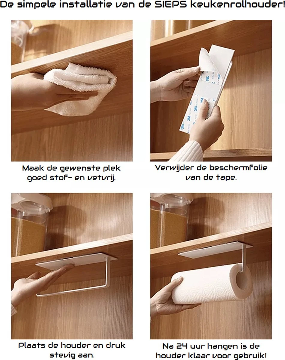 Gewoon even de plek waar de keukenrolhouder moet komen goed stof en vetvrij maken, de beschermlaag van de tape verwijderen en opplakken. Je drukt de tape op meerdere plekken stevig aan en laat de rolhouder dan 24 uur hangen. Hierna hangt de houder super stevig en is deze klaar voor gebruik!