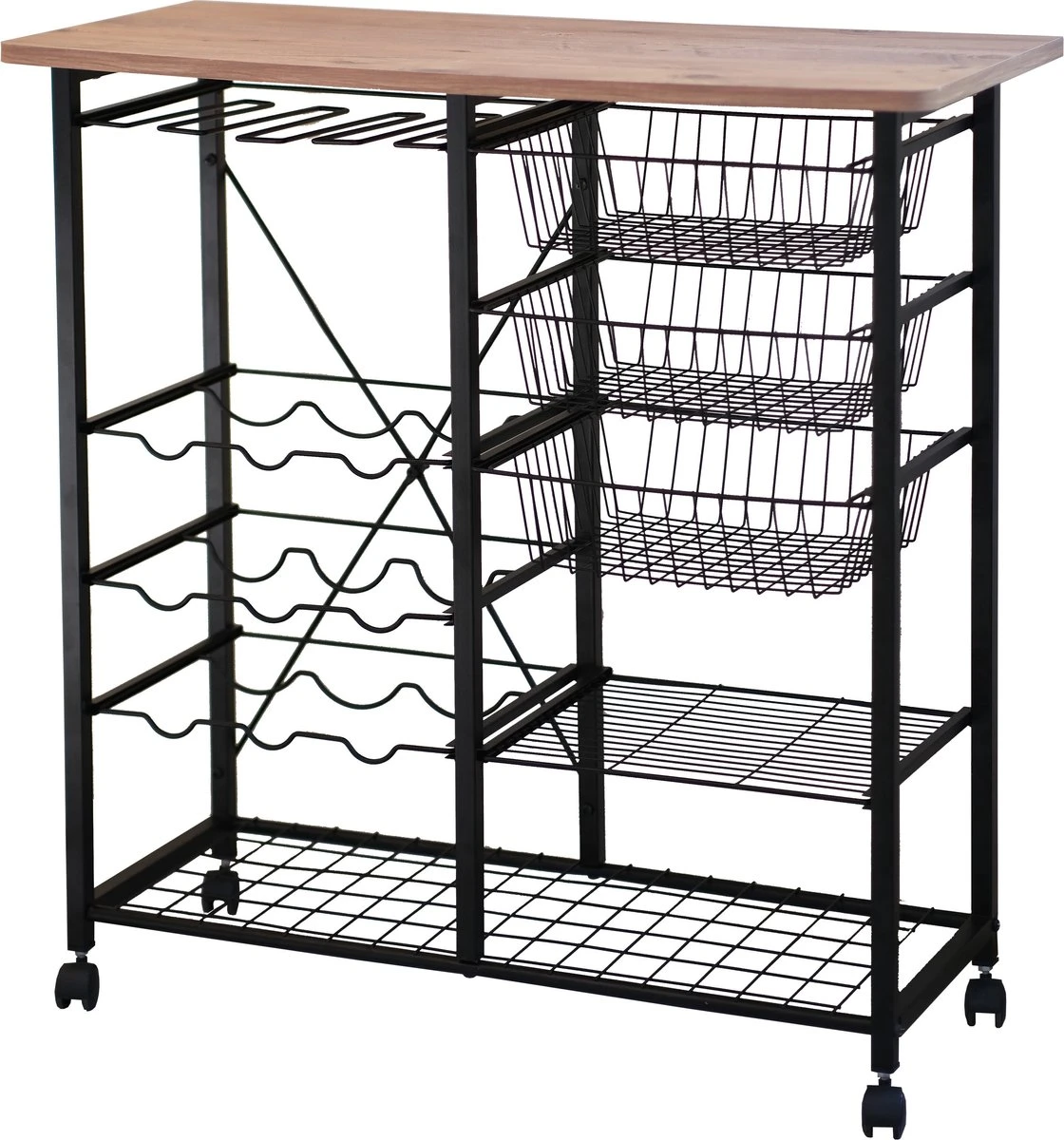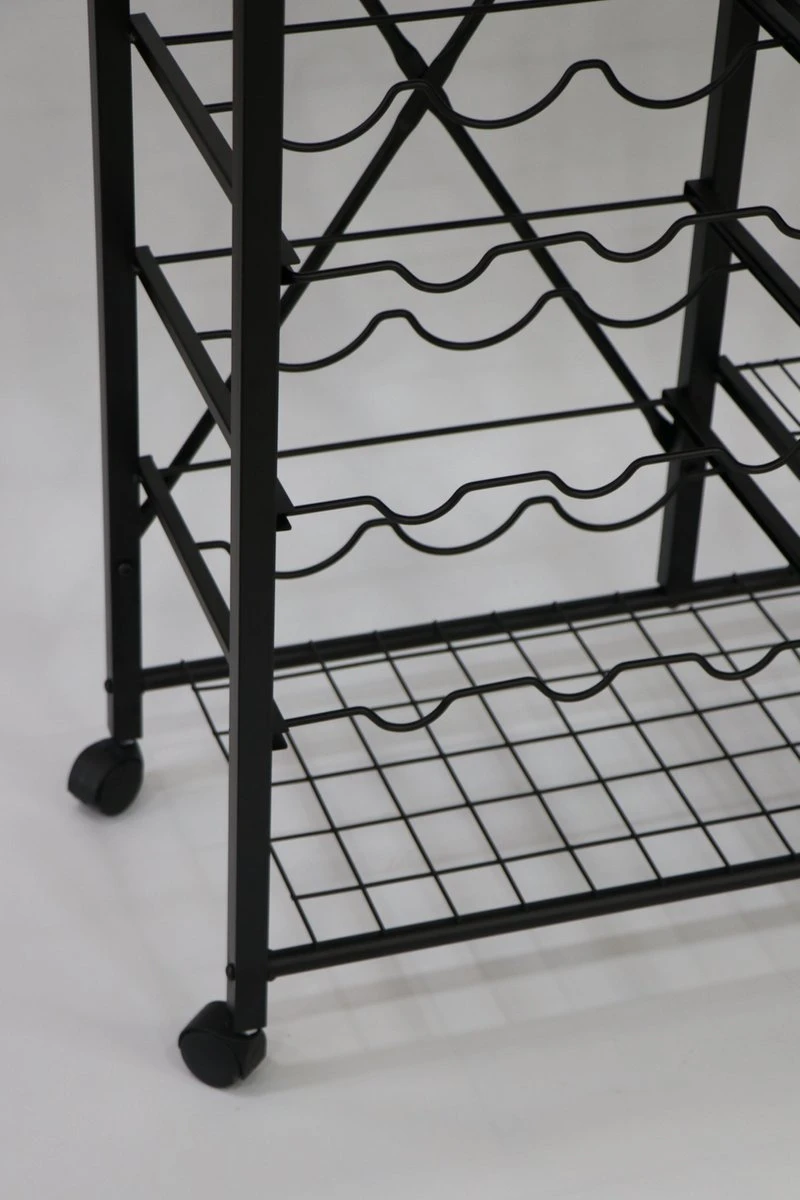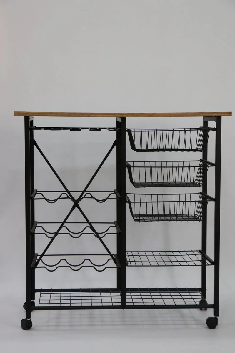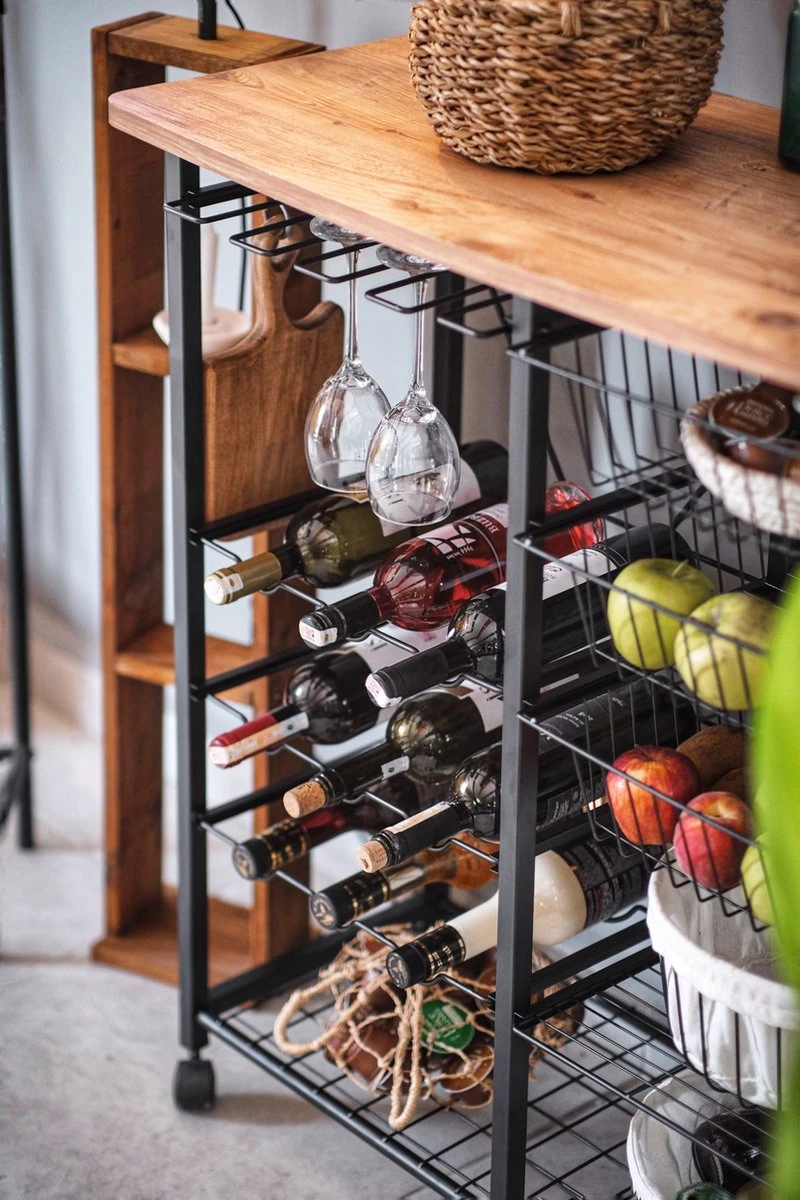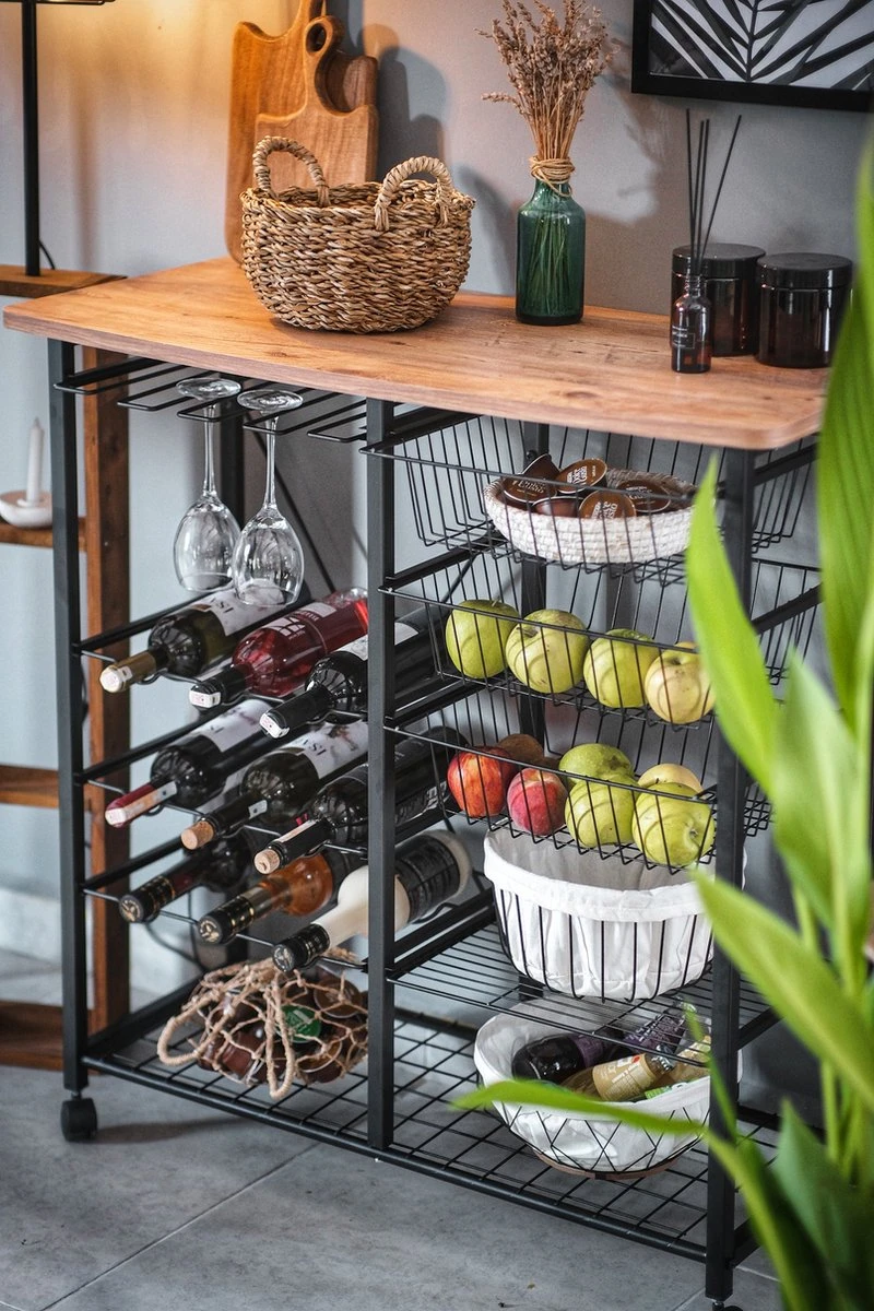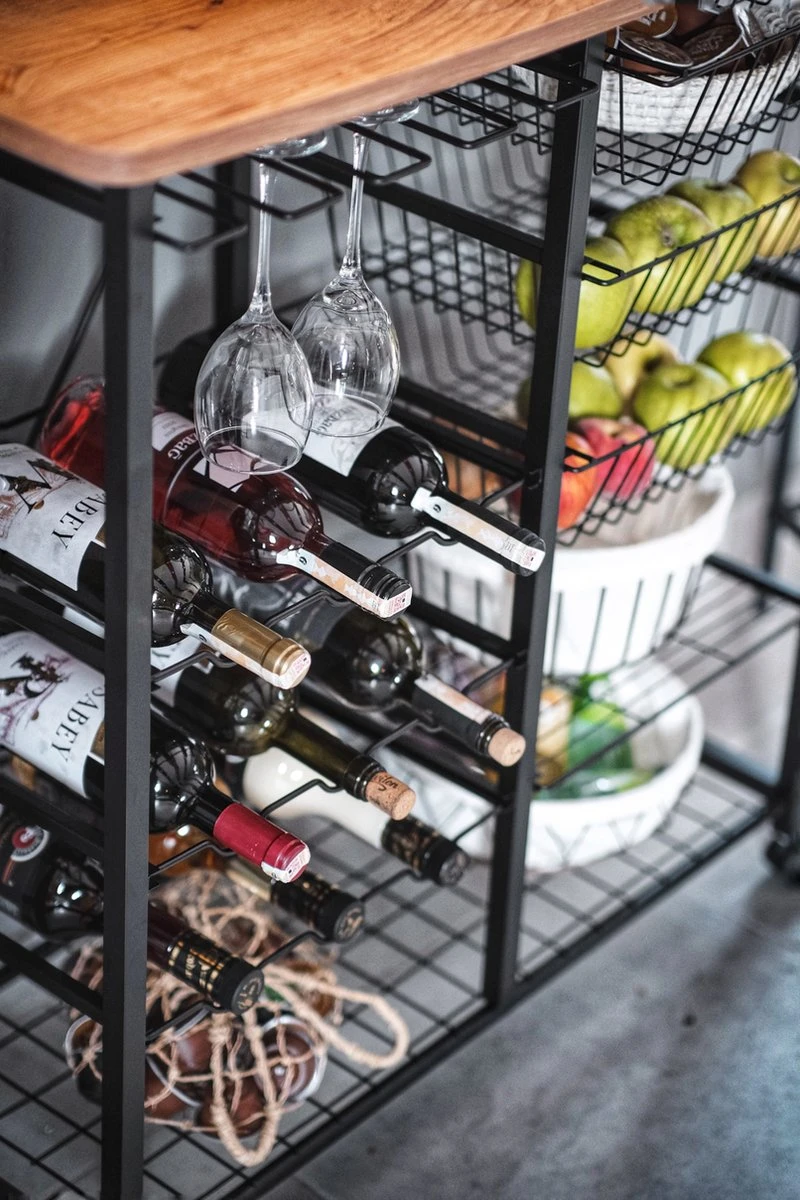 - Op het menu: 3 houders voor wijnglazen, 6 voor flessen, een groot oppervlak en een ruime plank onderaan. U kunt deze serveerwagen met wielen gebruiken als een mobiele bar. Heerlijke gerechten en uw magnetron vinden ook een thuis