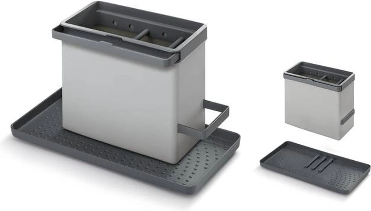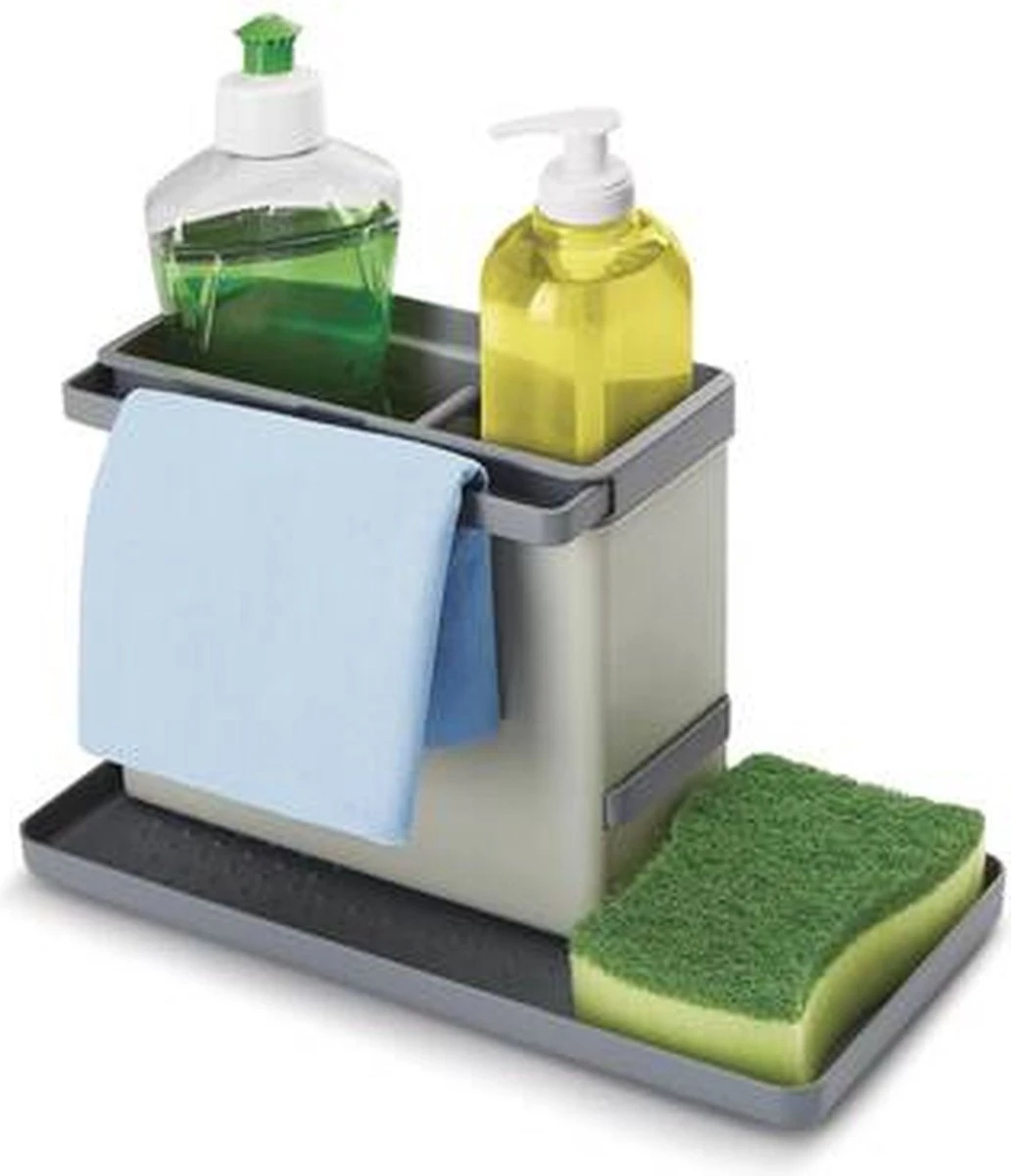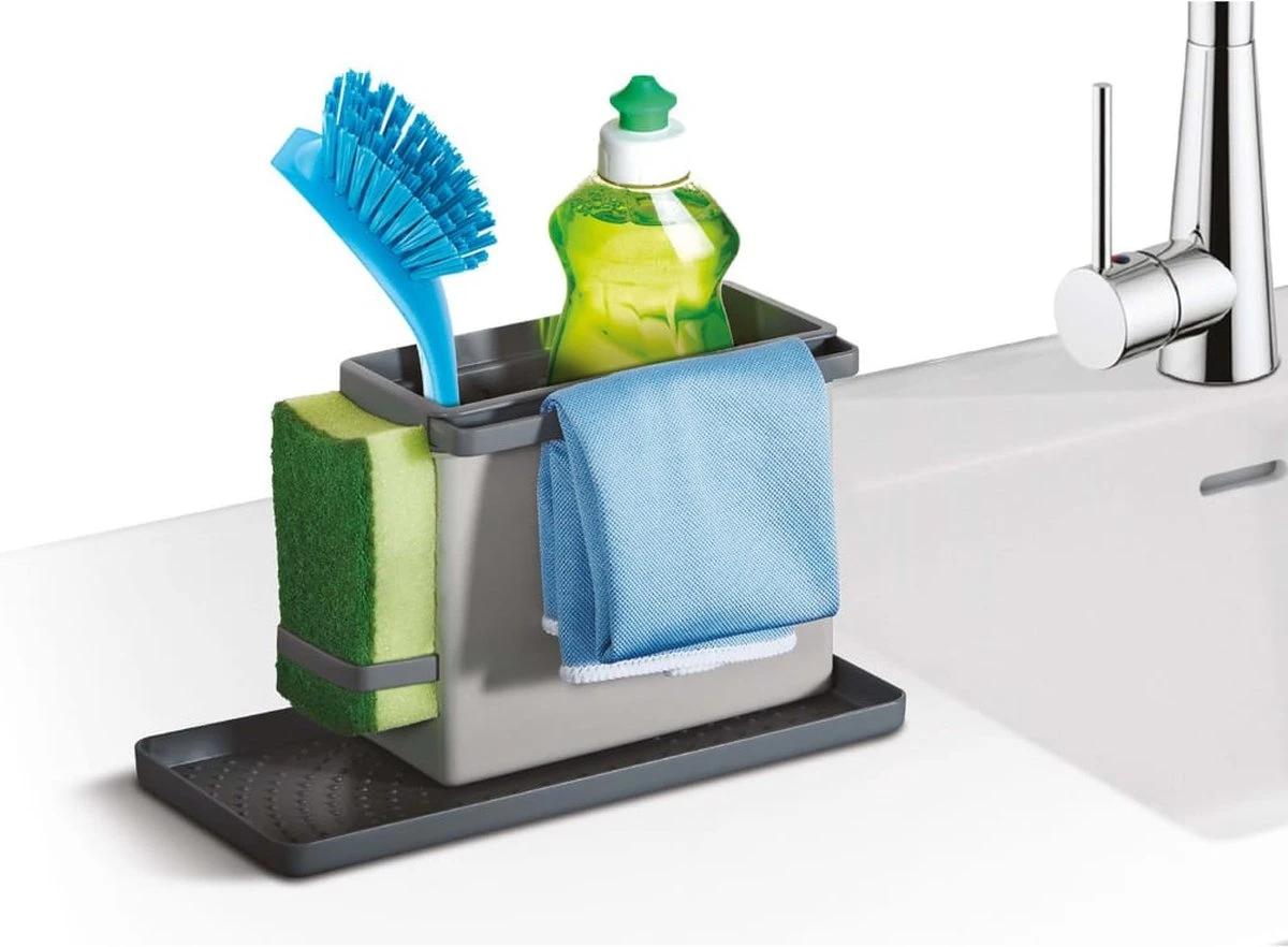 Dit rek biedt ruimte voor het bewaren van je afwasmiddel en afwasborstel. Het heeft twee verlengbare rails om vochtige doekjes en sponzen op te hangen. De organiser is modulair en kan op verschillende manieren worden gemonteerd zodat hij overal past.