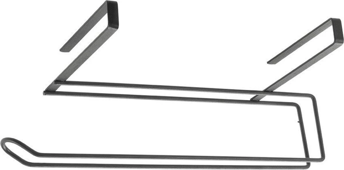 De zwart hangende keukenrolhouder is 35 cm breed, 18 cm diep en 10 cm hoog. Daarnaast is de keukenpapier houder zonder schroeven of lijm te bevestigen door de houder gewoon over een plank te schuiven. De maximale dikte waar de keukenrolhouder op past is 2 cm. Bij alle normale keukenkastjes zal dit passen aangezien deze 2 cm zijn.