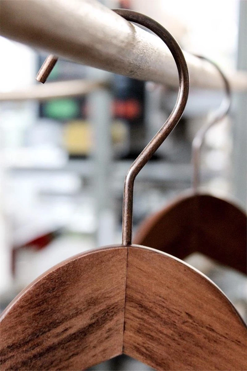 Bruine houten garderobehangers afgewerkt in vintage stijl. De dikke draaibare haak van old copper maakt de vintage stijl van deze garderobehangers helemaal af.