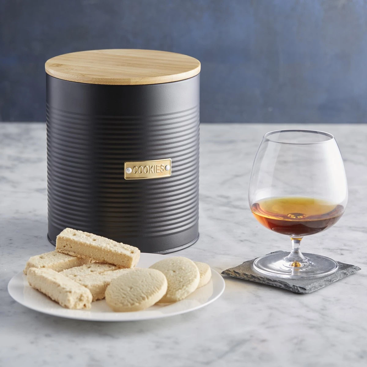 De Typhoon Otto koekjestrommel heeft een geribbeld ontwerp in mat zwart, dat op elk keukenblad past. De gouden ‘Cookie’-badge geeft een vleugje elegantie en glamour en houdt je tegelijkertijd praktisch en georganiseerd.