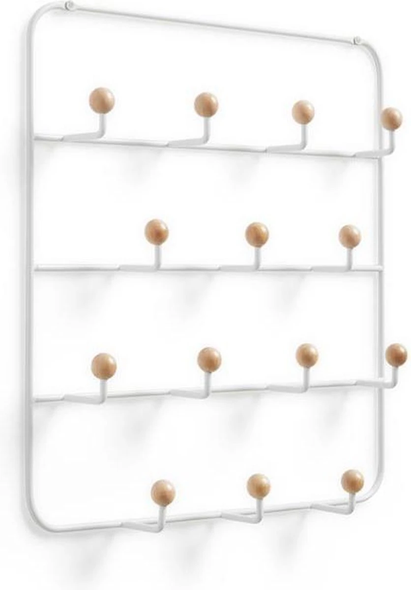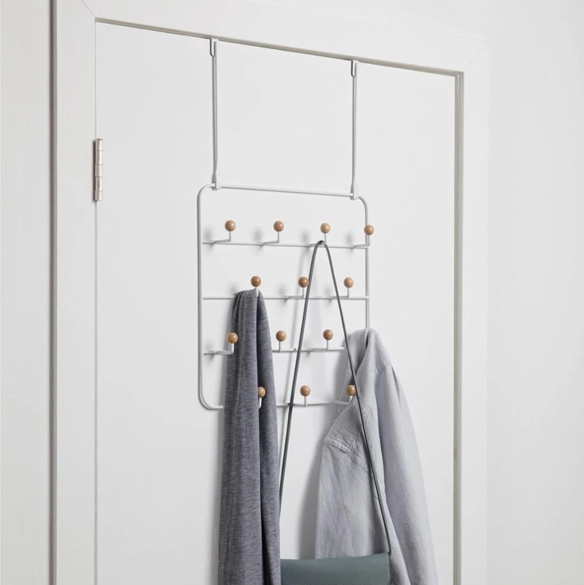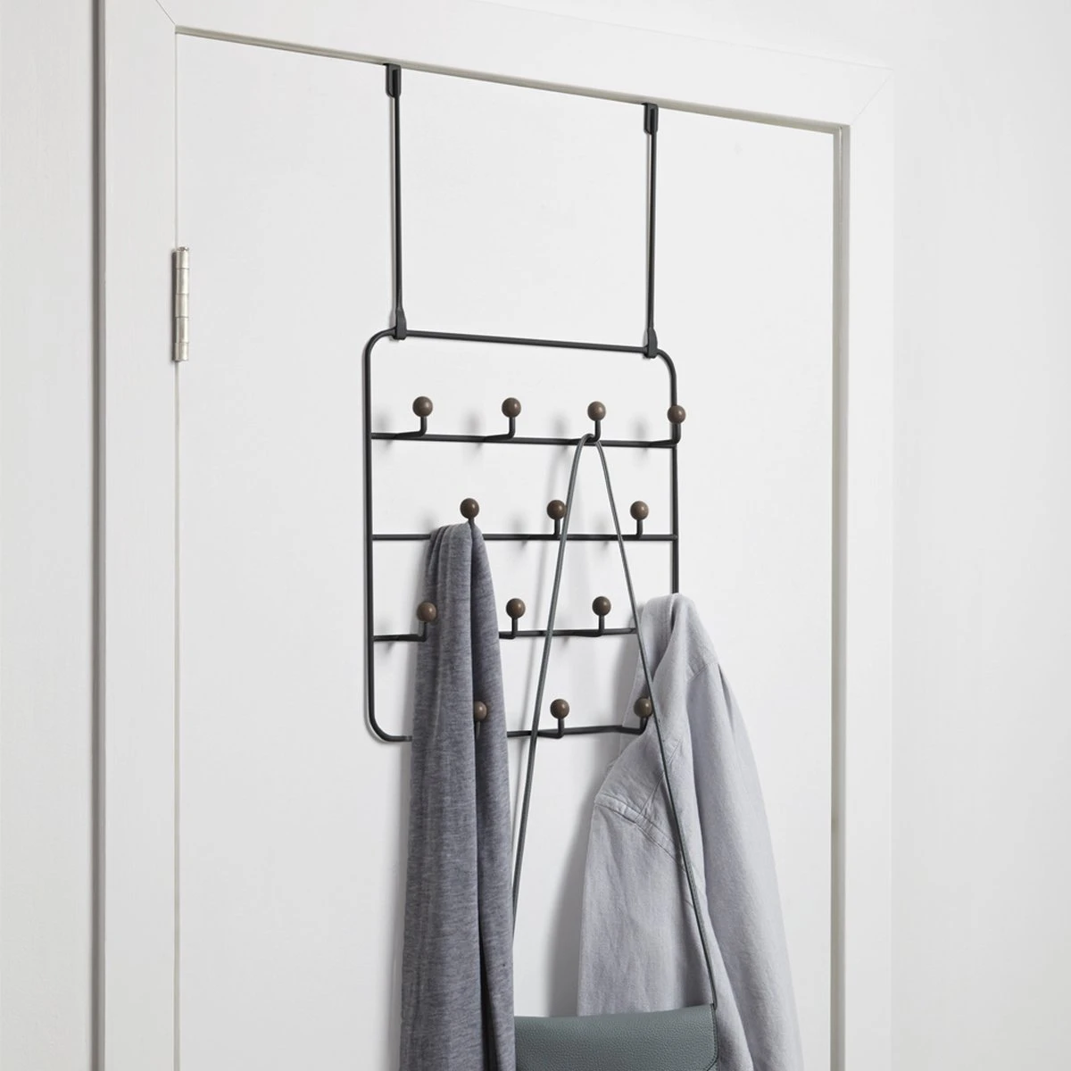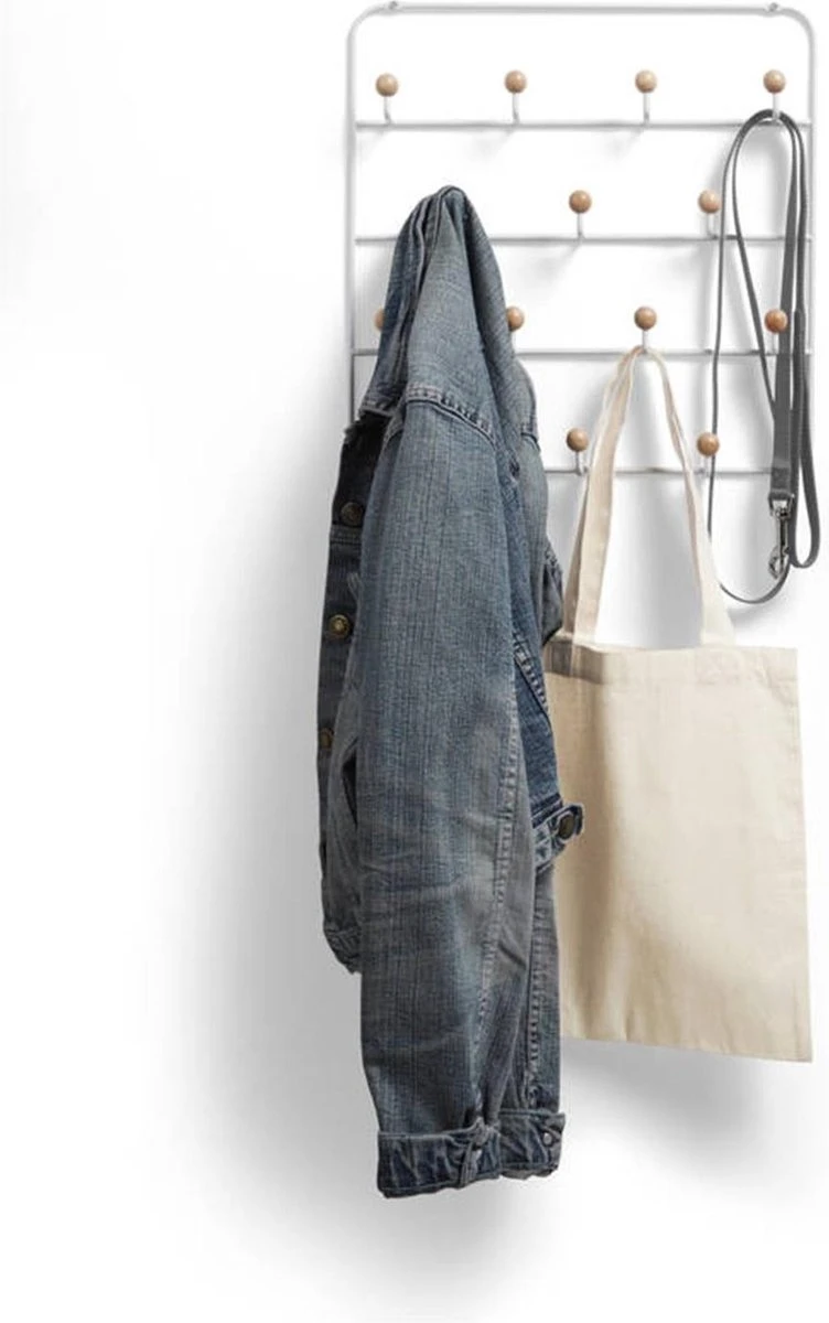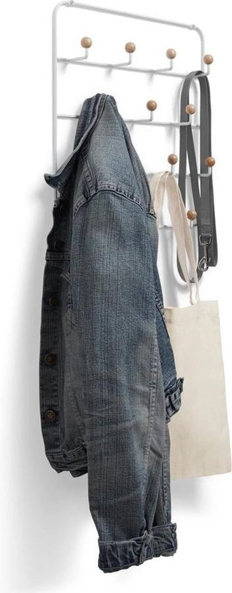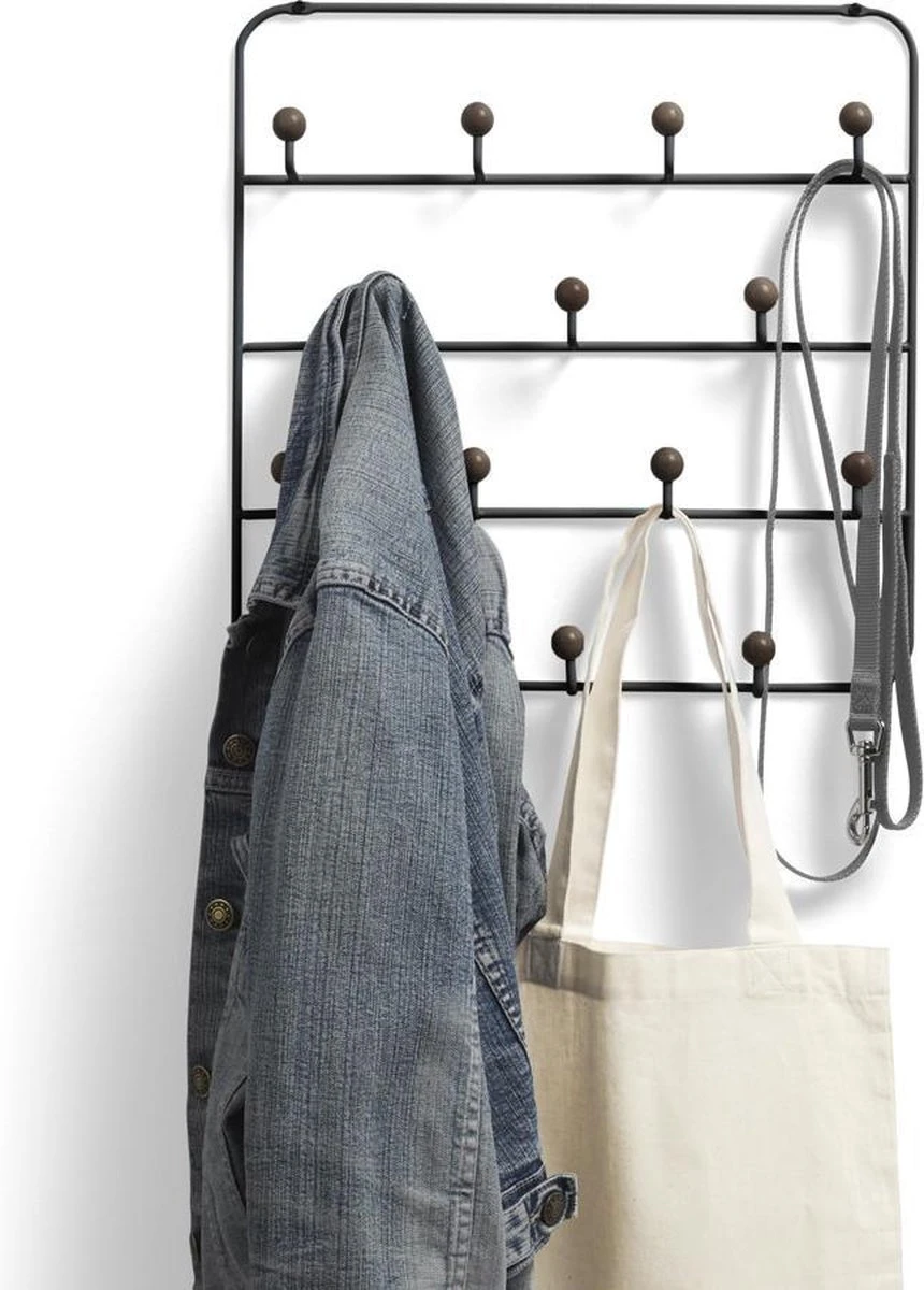 Het rek Estique van Umbra met 14 ophanghaken, kun je zowel aan de muur bevestigen als over een deur hangen. Zo vind je altijd wel een plekje om dit handige rek ergens op te hangen. Het rek biedt ruimte voor al je jasses, tassen, sjaals enzovoort.
