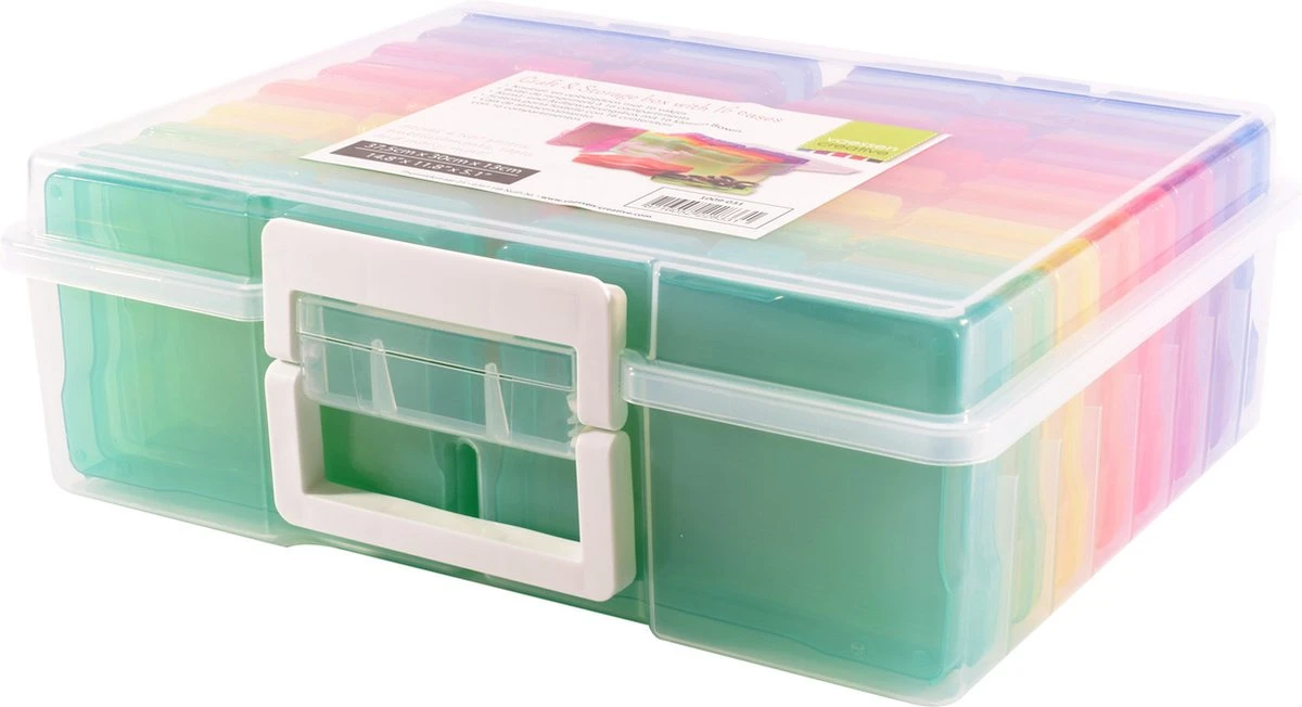 Organiseer je knutselspullen gemakkelijk met deze praktische opbergbox van Vaessen Creative. De box is gemaakt van doorzichtig plastic en is 37,50 x 30 x 13 cm groot. De box wordt geleverd met 16 kleinere doorzichtige plastic doosjes van 17 x 12 x 3 cm in verschillende kleuren: turquoise, groen, geel, oranje, rood, roze, paars en blauw (twee per kleur). De kleine doosjes zijn perfect voor het opbergen van strijkkralen, snijmallen, stickers, verf, kralen, glitter, knopen, foto’s, steentjes, stempels, sieraden en allerlei gereedschap en accessoires. Je kunt je knutselspullen op kleur, maat of categorie sorteren, zodat alles gemakkelijk te vinden is. Zowel de grote box als de kleinere doosjes hebben een handige kliksluiting. Deze opbergbox is erg handig als je houdt van kaarten maken, sieraden maken, naaien, scrapbooken of knutselen met kinderen.