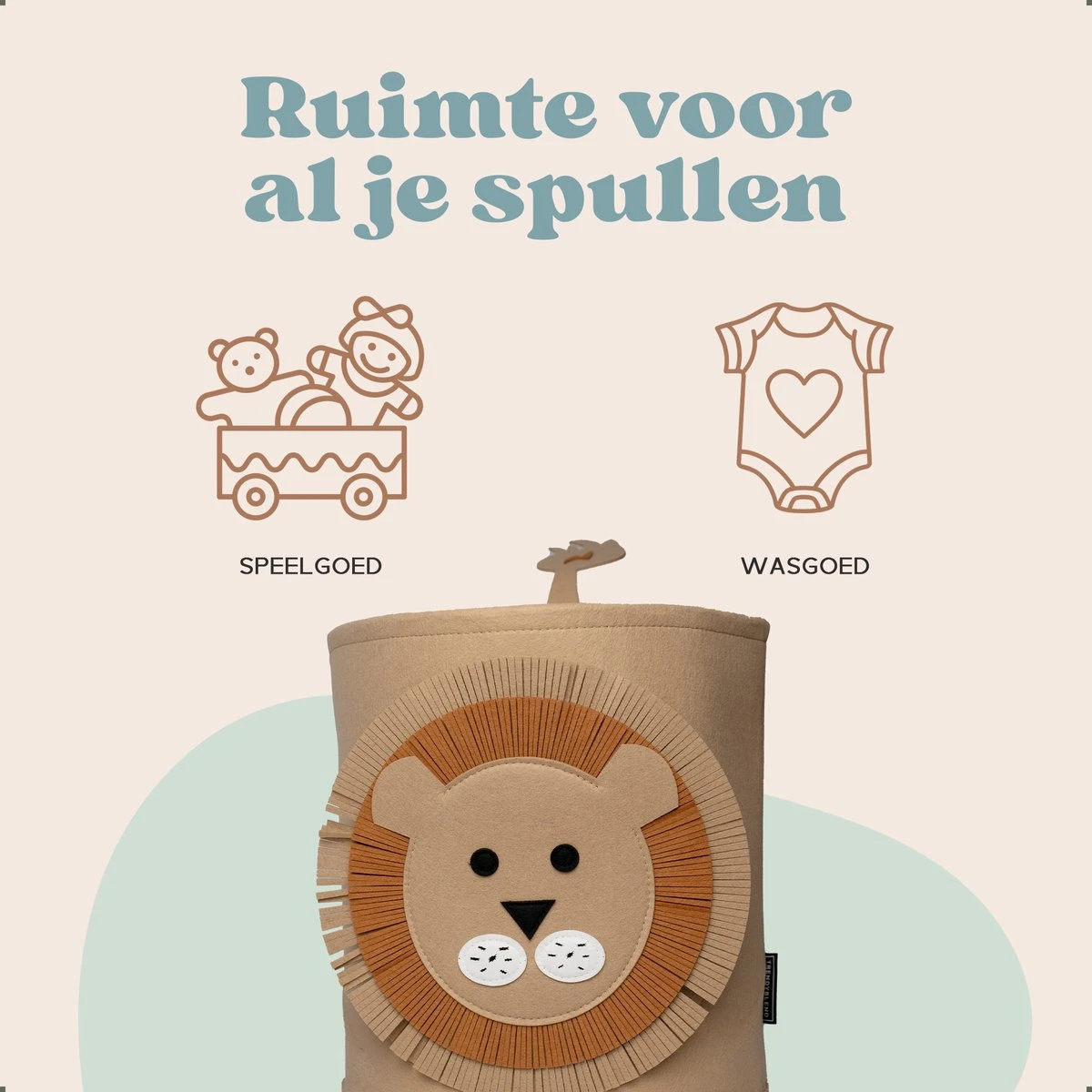 Onze speelgoedmand transformeert de kamer van je kleintje tot speelse jungle. Met een vrolijke leeuwenkop en leuke staart lijkt onze wasmand net echt en zal je kleintje z’n spullen met liefde opbergen.