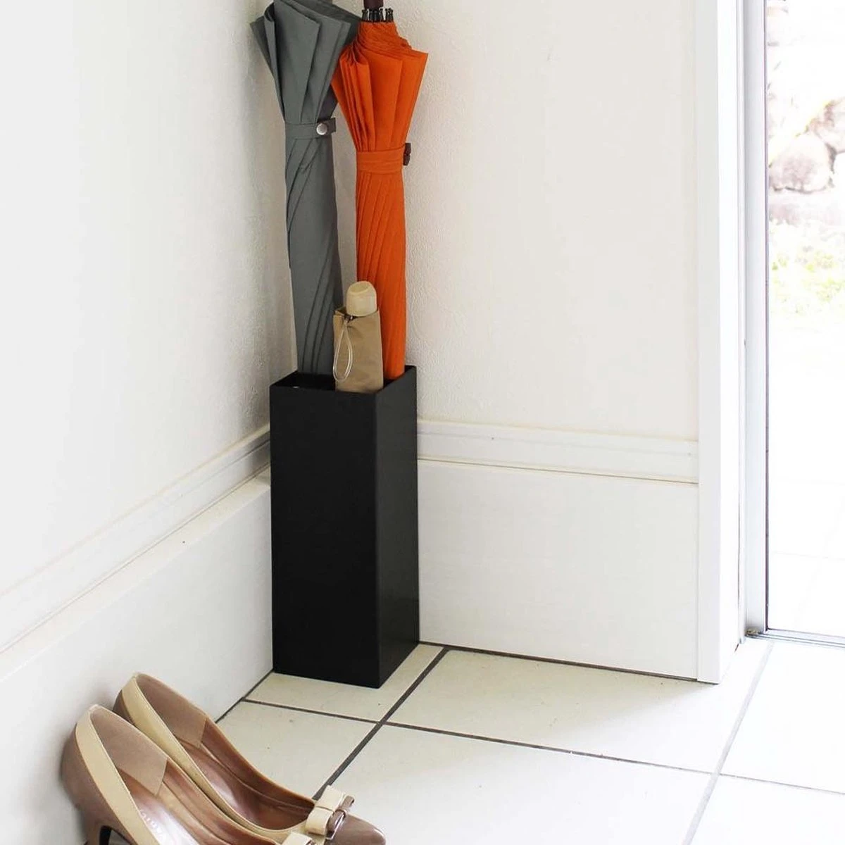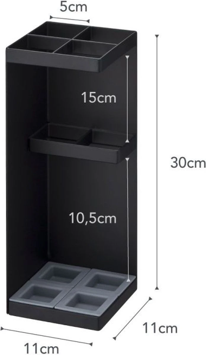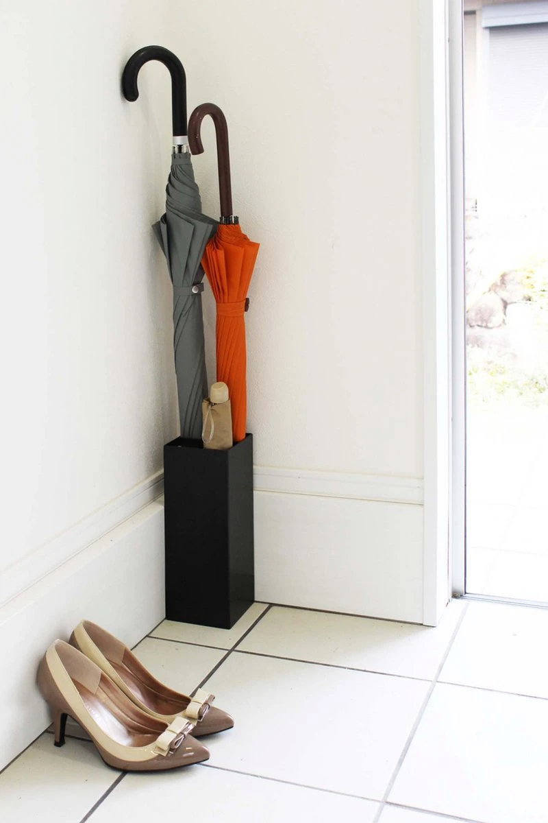 De paraplubak is zwart en is gemaakt van gepoedercoat staal. De uitneembare bakjes zijn van ABS kunststof. Door de hoogte van 30 cm passen ook lange paraplu’s in de parapluhouder en wordt je paraplu opbergen een eitje. Verder is de bak 11 cm breed en 11 cm diep.