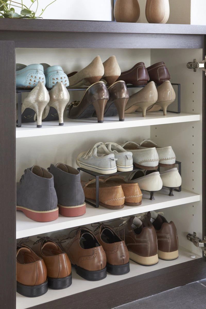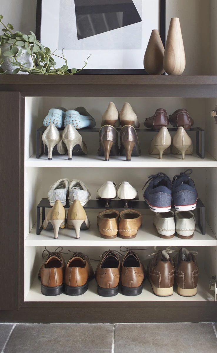 Prachtig stijlvol schoenen opbergsysteem van Yamazaki. Het schoenenrek is uitschuifbaar, wat ideaal is als je het in een kast wilt zetten – pas de breedte aan zodat het rek perfect past!