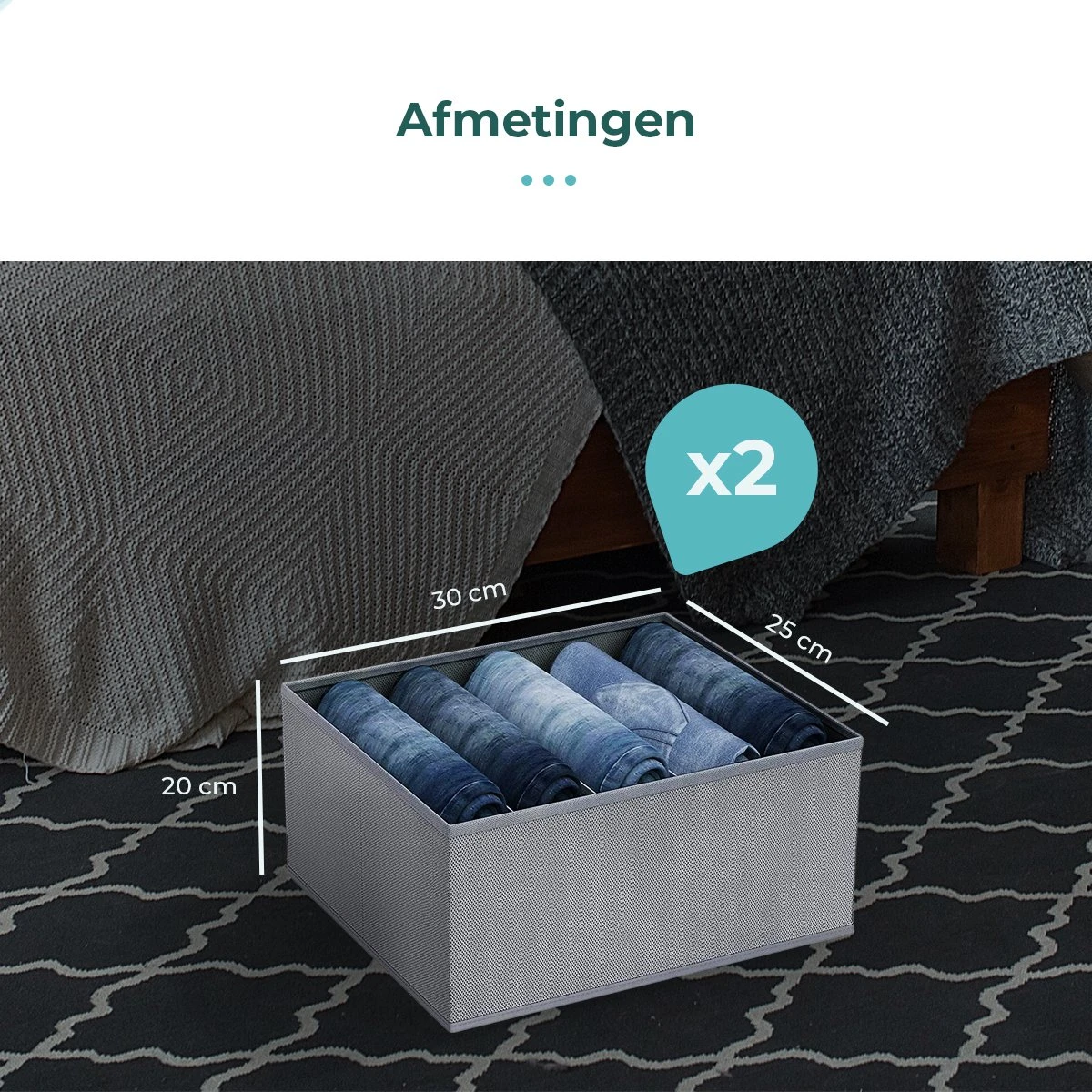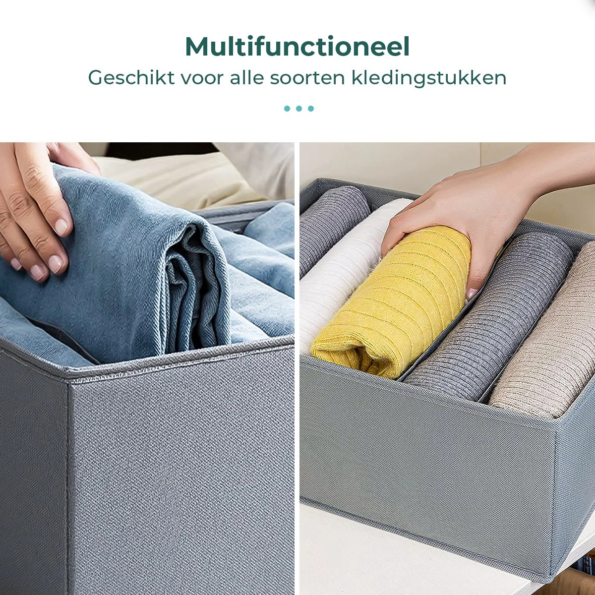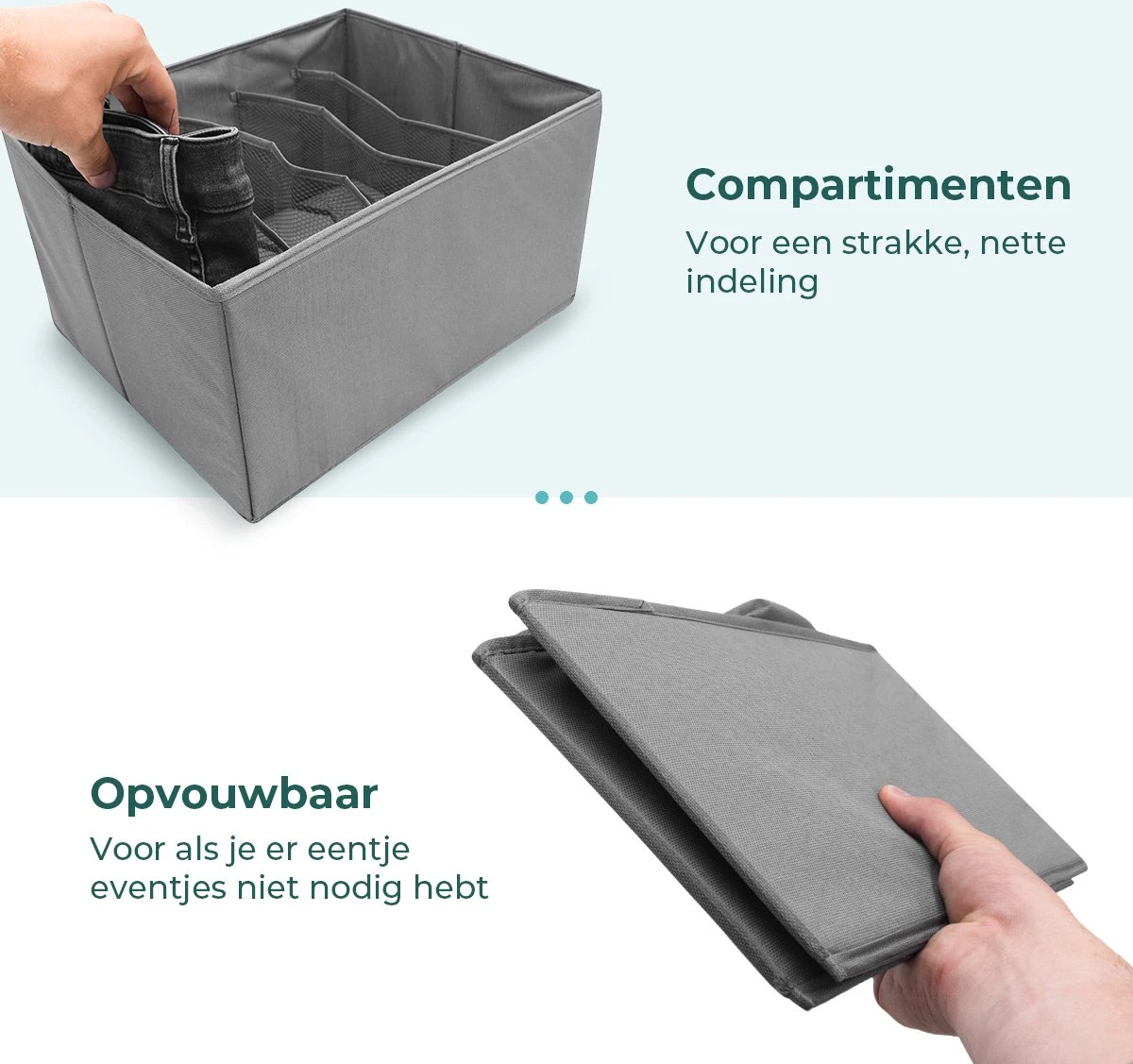 De kleding organizer kan in een platte vorm worden opgevouwen. Zo zijn ze eenvoudig op te bergen wanneer ze niet in gebruik zijn. Je kunt de kledingkast organizer samen in de kast of lade stapelen om ruimte te besparen. Door het hoogwaardige materiaal is deze opbergmand gemakkelijk schoon te maken. Veeg hem af met een vochtige doek en laat hem aan de lucht drogen.