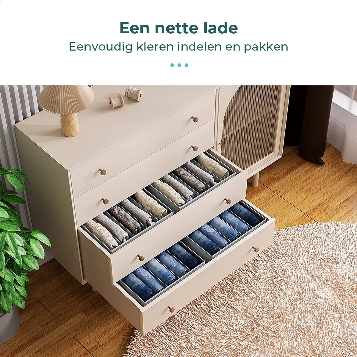 Onze kledingkast organizer is multifunctioneel in gebruik. Hij is ideaal voor broeken, jeans, truien, t-shirts, leggings, rokken en meer. De broeken organizer biedt dus voldoende ruimte voor jeans en broeken. Er zijn meerdere compartimenten voor het sorteren en ordenen van je spullen om je leefruimte netjes te houden.