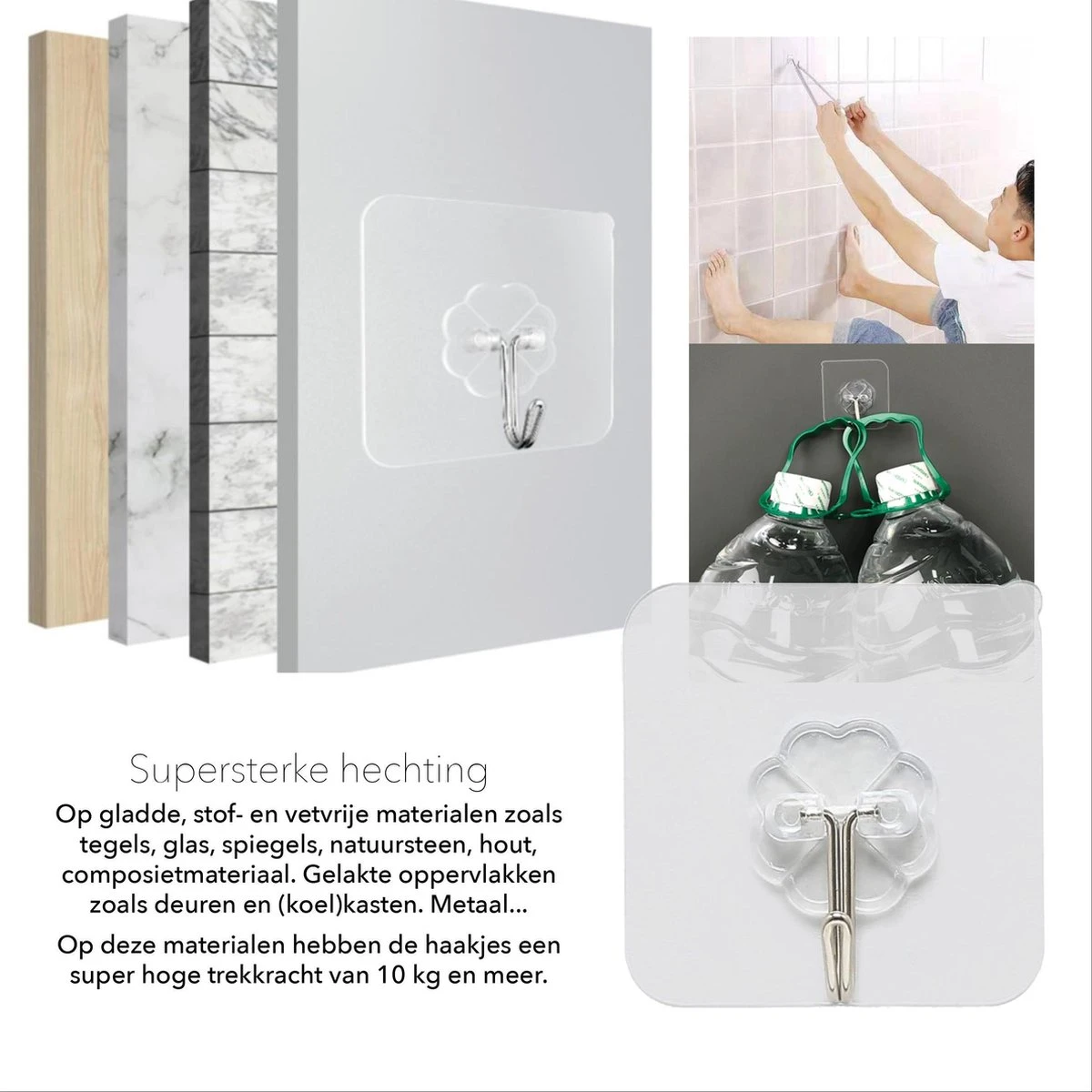 Creëer meteen extra opberg- en kastruimte. Met deze waterbestendige en supersterke zelfklevende haakjes wordt het organiseren van je spullen in de badkamer, keuken of berging een fluitje van een cent. De supersterke hechting werkt op elk oppervalk dat vlak, stof- en vetvrij is. Natuursteen, composietmateriaal, tegels, hout, glas, metaal, gelakte materialen, kunststof, spiegels enz.