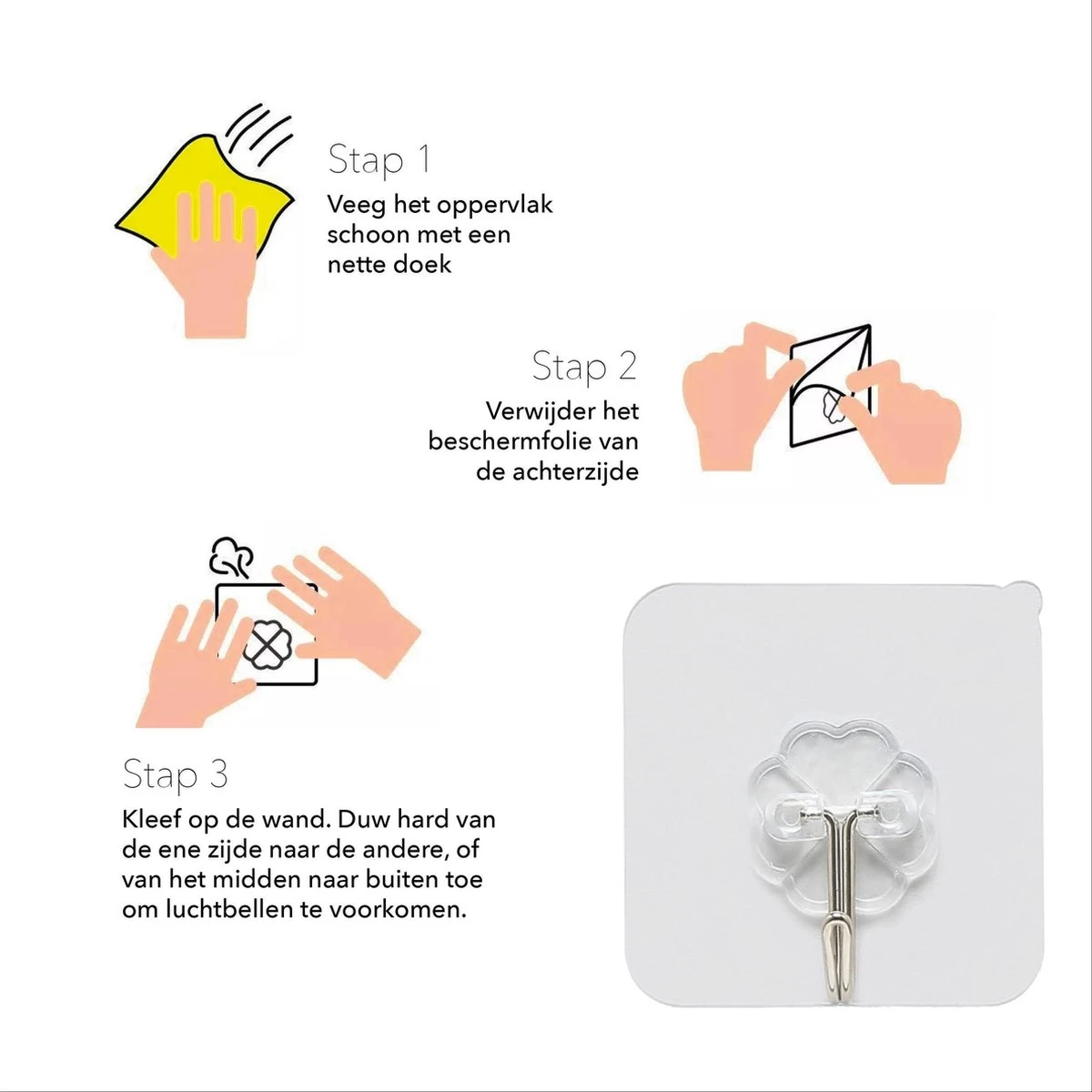 - Zorg dat de plaats waar je het haakje wil kleven goed droog is.